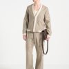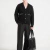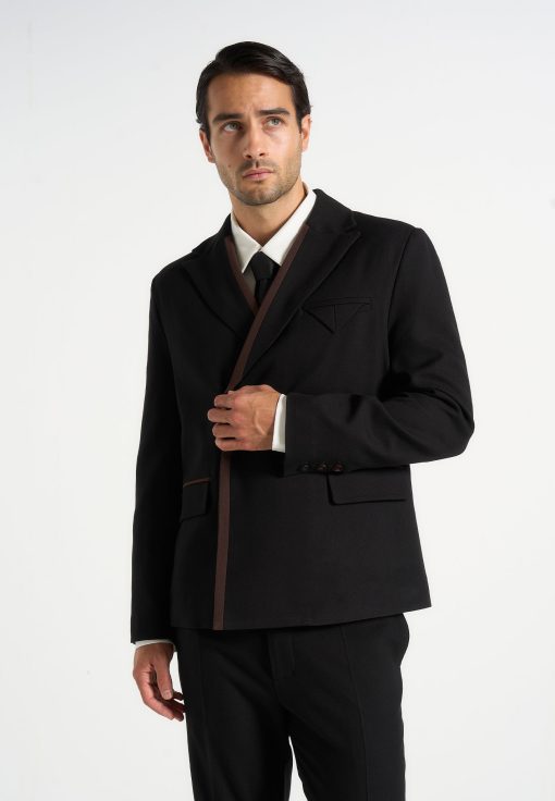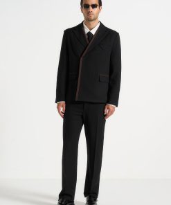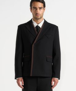 Designed with modern structure and finished with a contrast lapel, the double-breasted suit jacket features pocket detailing in a tonal yet distinctive finish. Angular welt pockets offer sharp, directional lines, while tonal buttons keep the look cohesive and minimal. A clean silhouette crafted for versatile styling.