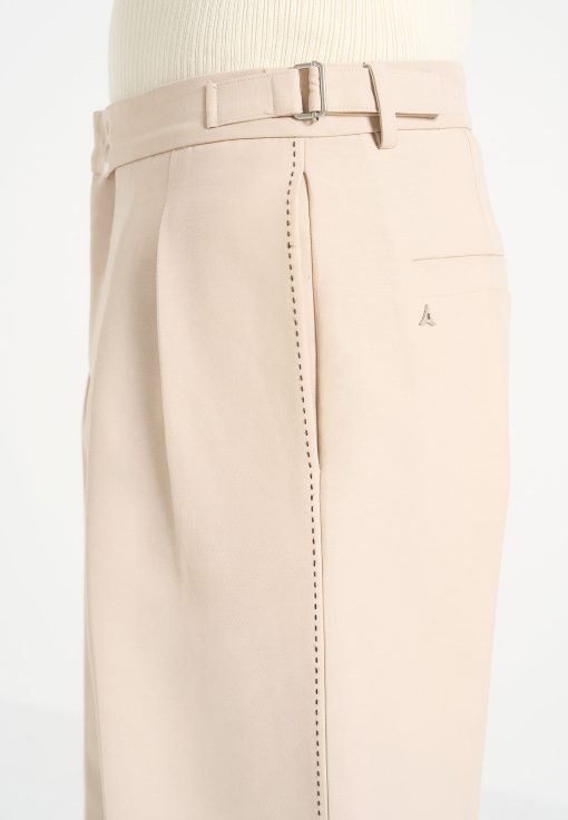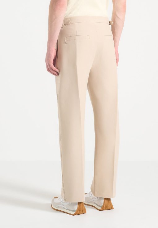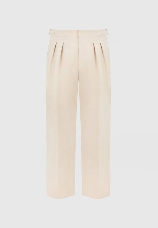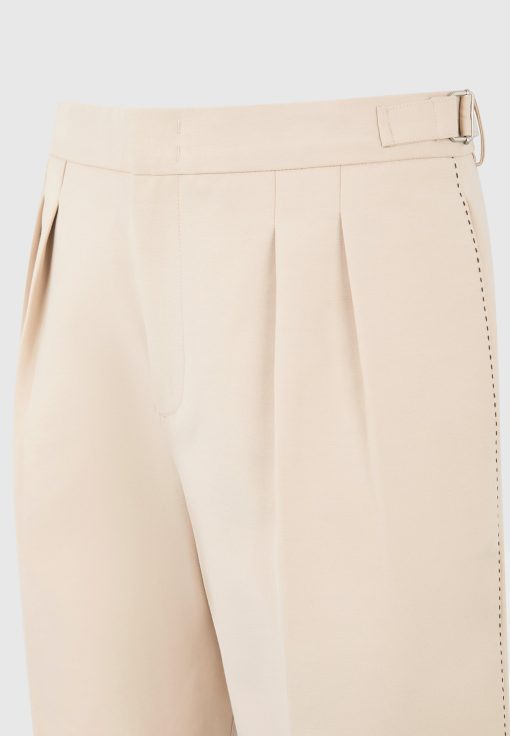 A refined take on traditional tailoring, the Twin Pleat Chino Trousers With Stitch Detail fuse classic structure with technical precision. Defined by sculptural twin front pleats and contrast topstitching along the leg seams, these trousers are finished with integrated side adjusters that deliver a custom fit without compromising the silhouette’s clean integrity.