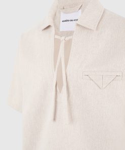 The Open Collar Textured Drawstring Shirt blends relaxed tailoring with subtle technical nuance. Crafted from a softly textured fabric, it features a contrast drawstring threaded through the open neckline, allowing for adjustable styling and added shape. A folded flap chest pocket introduces a sculptural touch to an otherwise fluid silhouette.