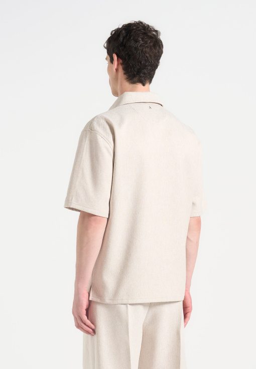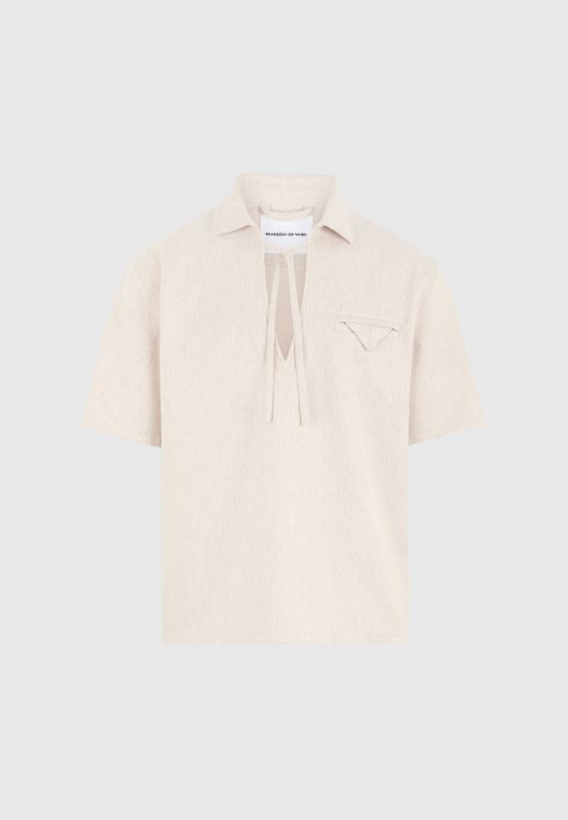 The Open Collar Textured Drawstring Shirt blends relaxed tailoring with subtle technical nuance. Crafted from a softly textured fabric, it features a contrast drawstring threaded through the open neckline, allowing for adjustable styling and added shape. A folded flap chest pocket introduces a sculptural touch to an otherwise fluid silhouette.