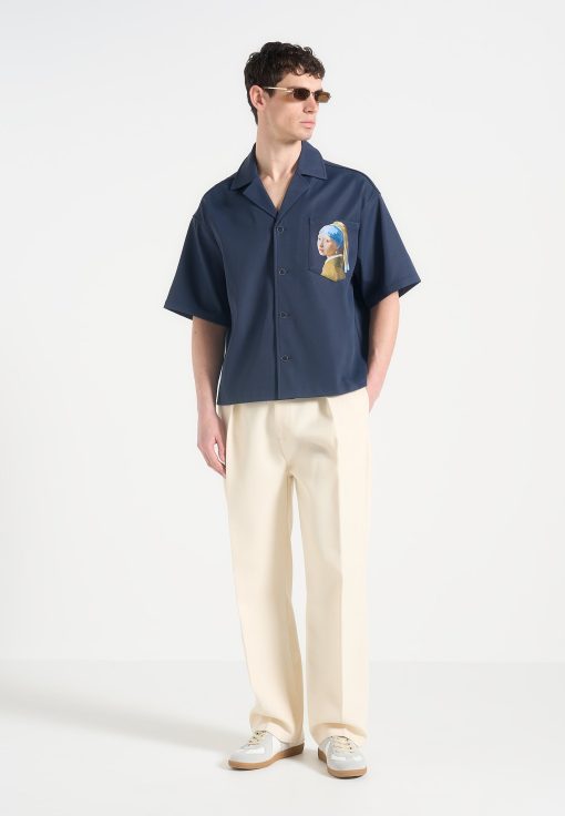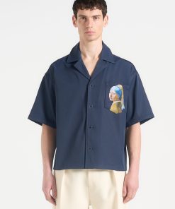 A fusion of art history and contemporary tailoring, the “Girl With A Pearl Earring” Boxy Shirt reframes a Renaissance classic through a modern lens. Featuring a digitally rendered chest print of Vermeer’s famed portrait, its oversized cut and clean revere collar balance statement design with wearable structure.
