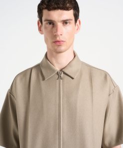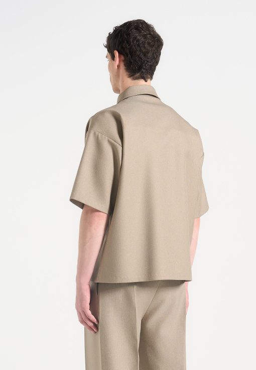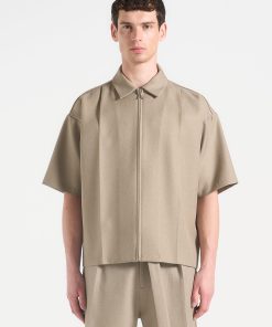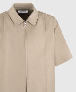 This Boxy Shirt is a versatile addition to any wardrobe. The concealed frontal zip provides a sleek and modern look, while the crease detail adds a refined touch. The neutral tone and classic collar make it easy to dress up or down, perfect for any occasion.