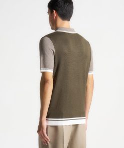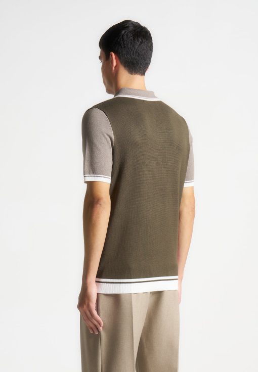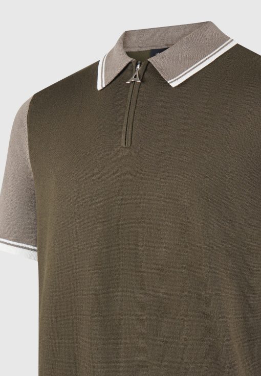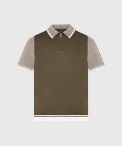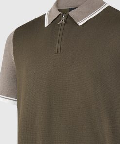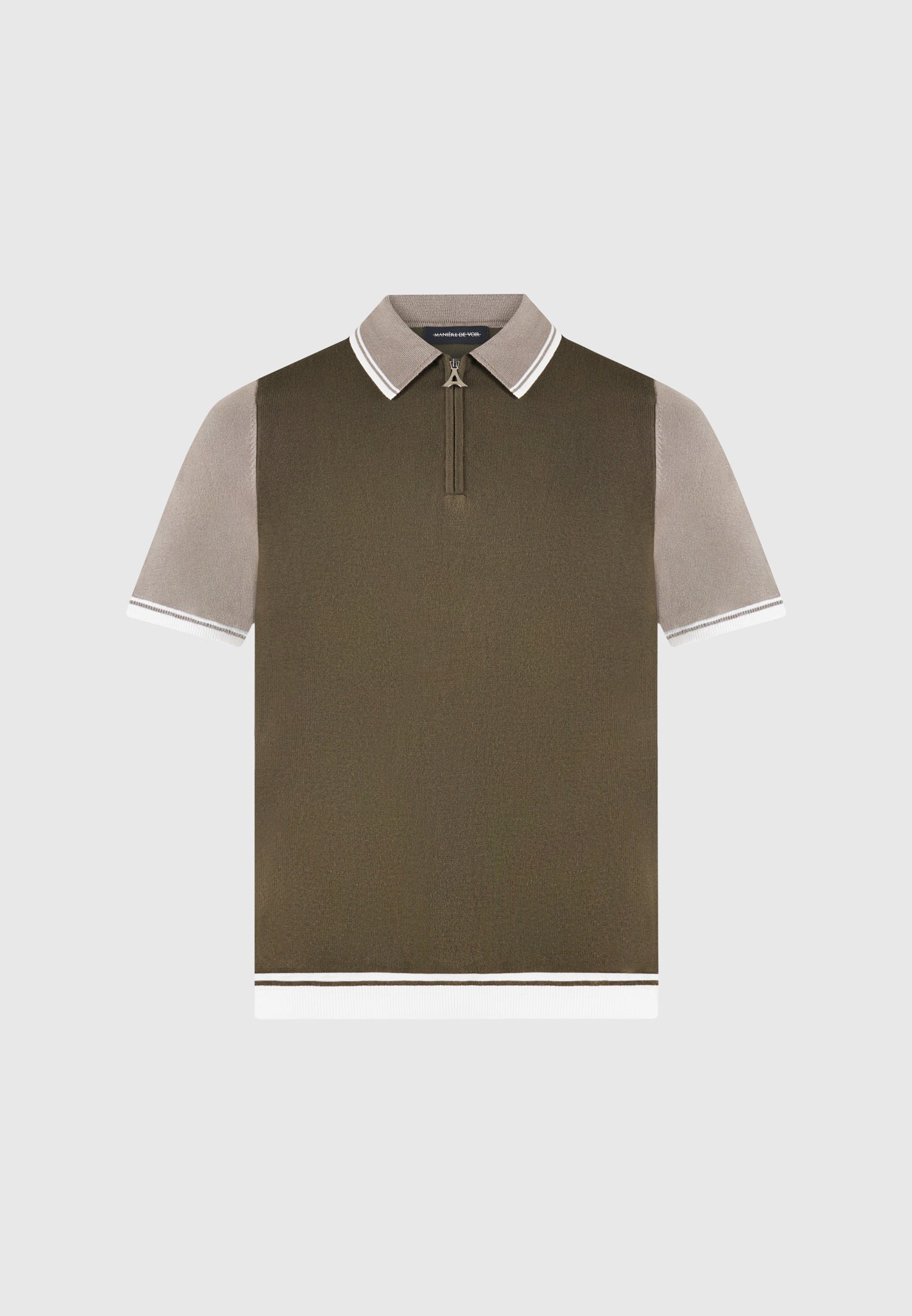 Experience unparalleled comfort and style with our Colour Block Zip Polo Shirt in Khaki. Boasting a short sleeve, fitted silhouette with a unique contrasting collar and sleeve, this Polo Shirt exudes effortless refinement for any casual or smart casual occasion.