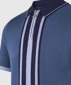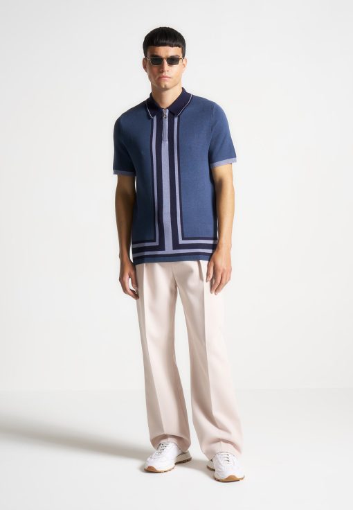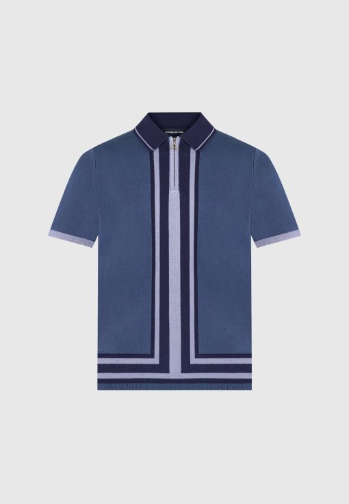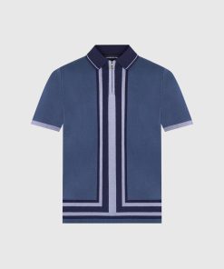 Introducing our Contrast Border Knit Zip Polo Shirt in Blue. Crafted from a soft knit fabric, it’s both breathable and warm, making it a perfect transitional year-round piece. Complete with Silver hardware accents, a functional quarter-zip and a fitted collar, this Polo Shirt blends functionality with style, making it a versatile essential for your wardrobe.