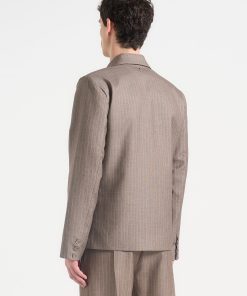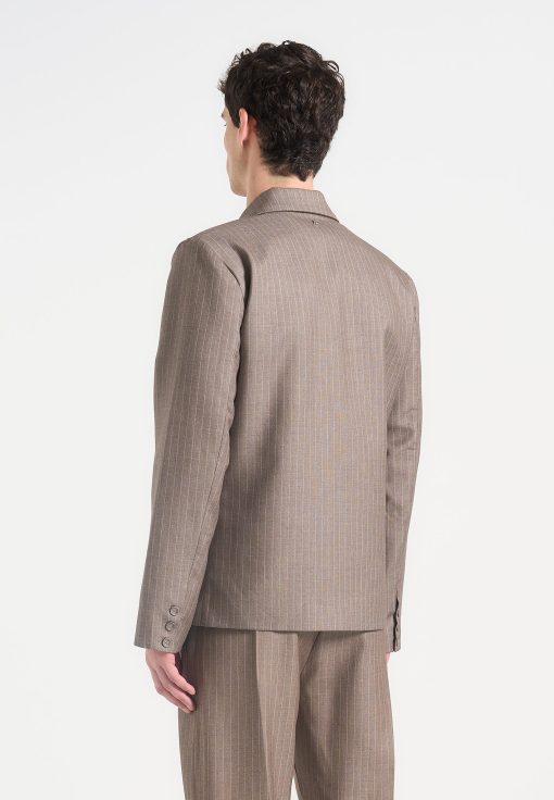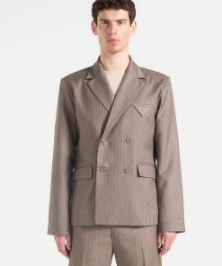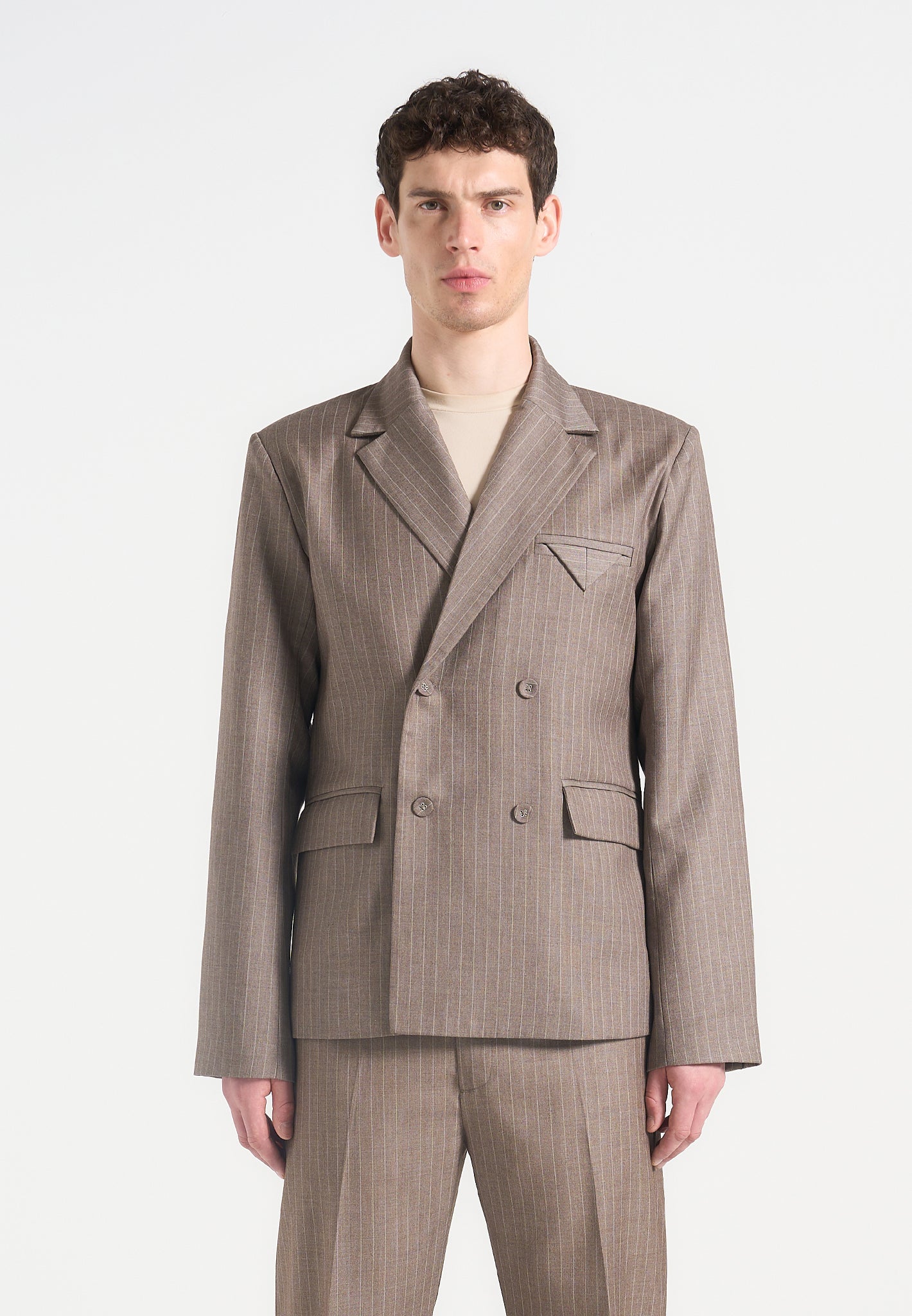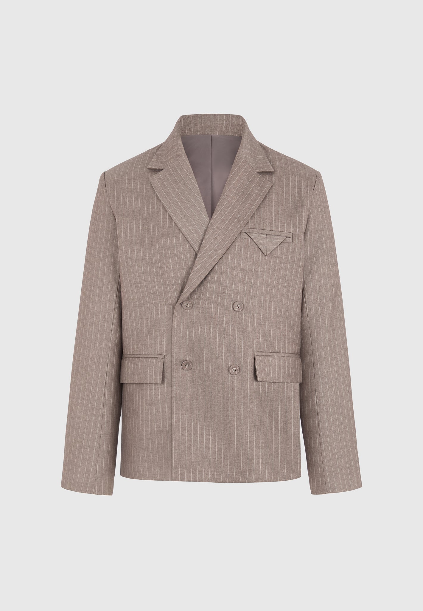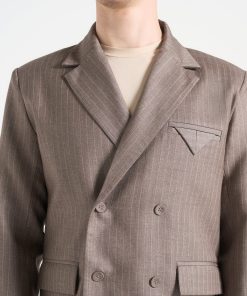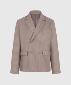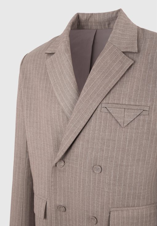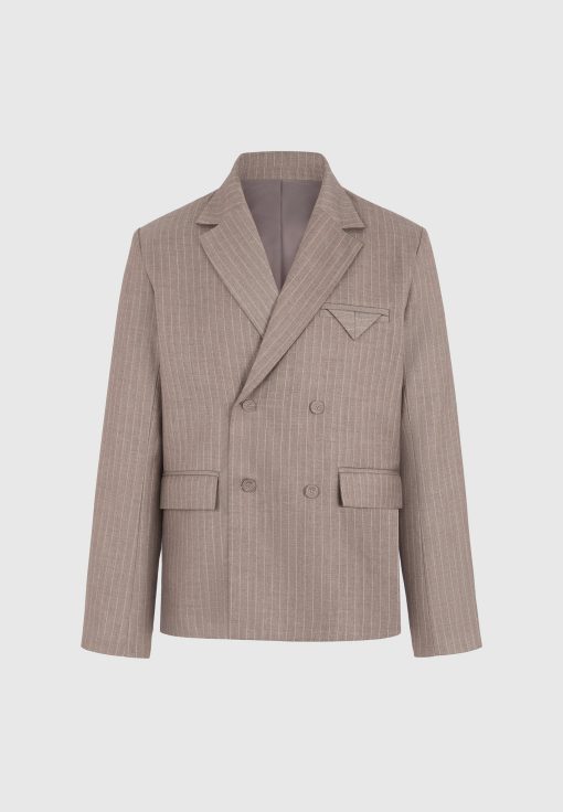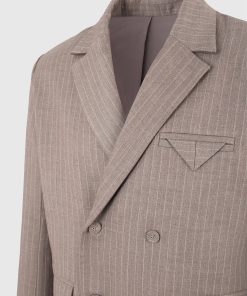 Built for sharp silhouettes and subtle impact, the Double Breasted Pinstripe Suit Jacket features a clean four-button closure, structured shoulders, and refined pinstripe detailing throughout. The folded flap chest pocket adds architectural balance, while peak lapels and a cropped length give it a bold, tailored stance.