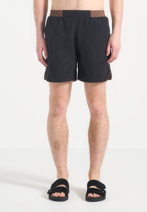 The Swim Shorts with Contrast Waist Band fuse utility with standout design, featuring a bold contrast elastic waistband that anchors the look while ensuring adaptive comfort. Designed for both poolside and street styling, the sharp piping trim reinforces the tailored shape, while the quick-dry fabrication delivers performance without compromise.