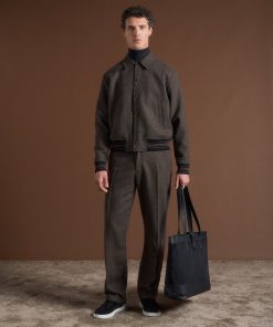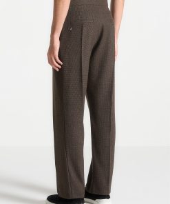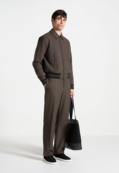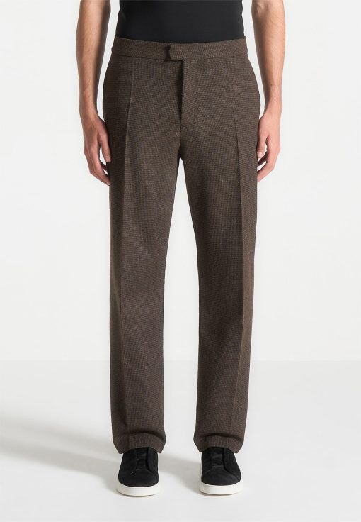 The Regular Fit Houndstooth Wool-Blend Trousers in Brown offer a refined take on classic menswear, crafted from a premium wool blend for warmth and durability. With a tailored, regular fit and straight leg, they feature a flat front, zip fly, and precision stitching. Side and welted back pockets add functionality to this elevated, timeless design.