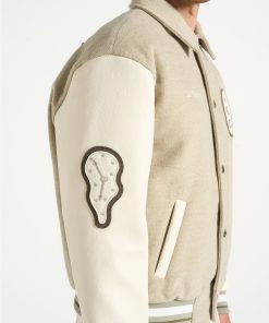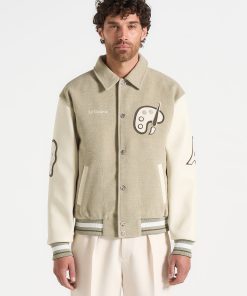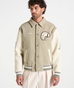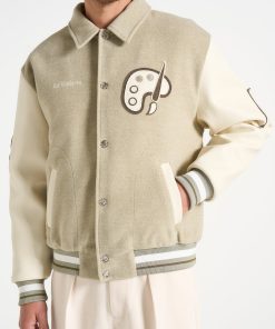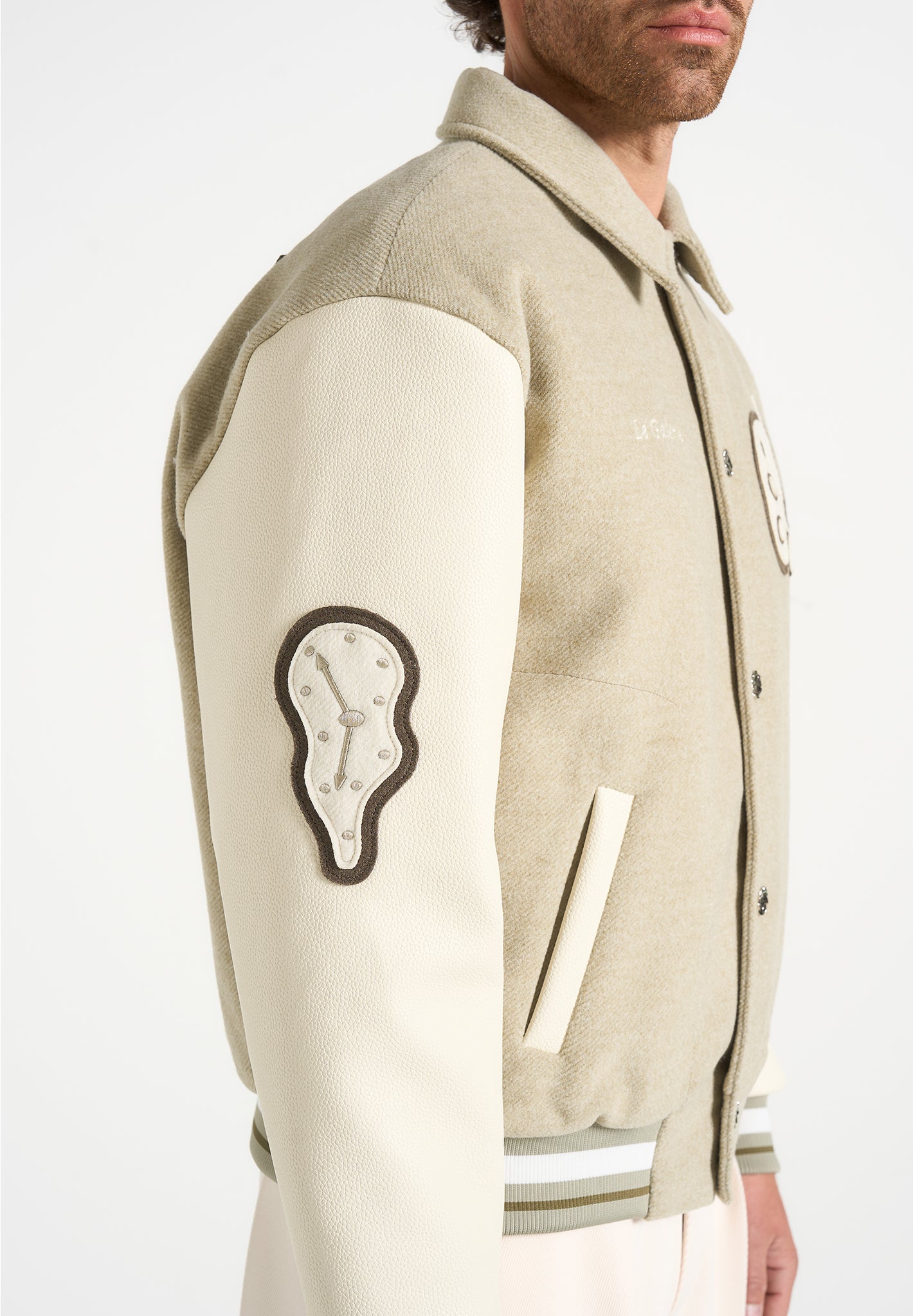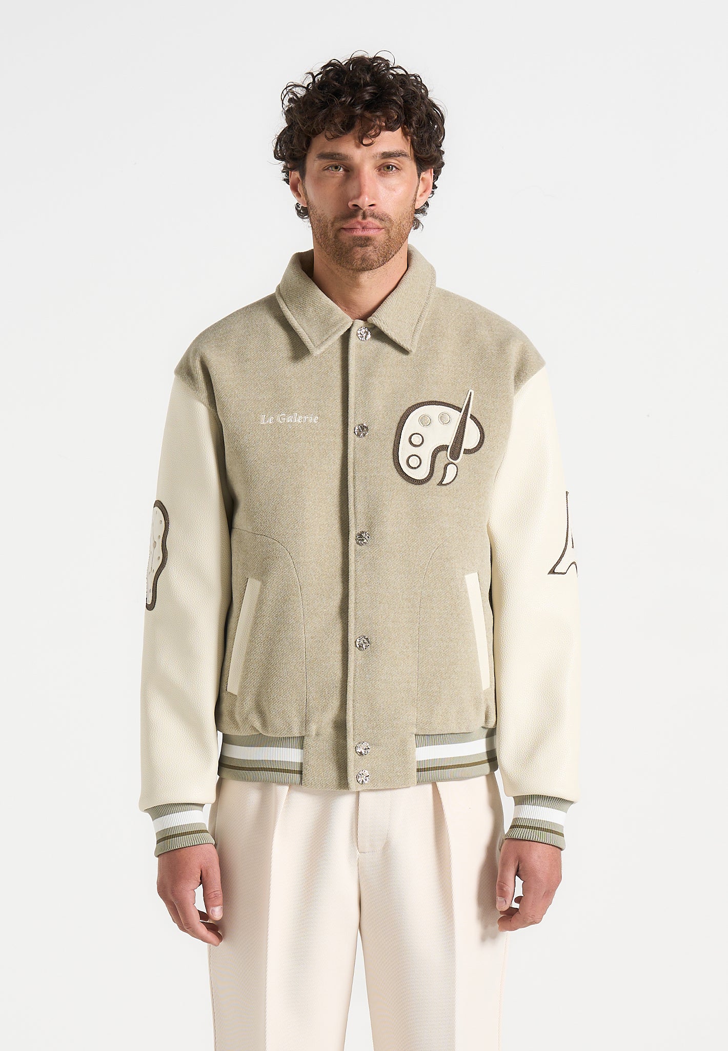 The Le Galerie Varsity Jacket offers a contemporary take on a classic design. Expertly crafted from soft, durable fabric and vegan leather sleeves, it delivers both rich texture and lasting durability. Detailed with bespoke in-house patchwork embroidery, this jacket showcases unique artistic craftsmanship. Its relaxed fit provides effortless layering, while textured metallic snap-buttons and practical side slip pockets add refined, functional touches to complete the look.