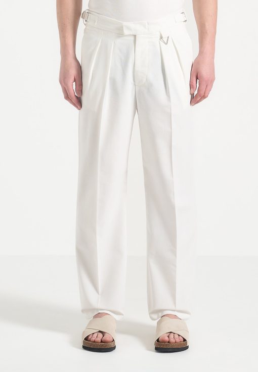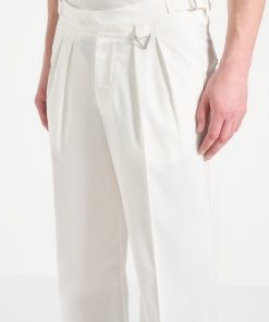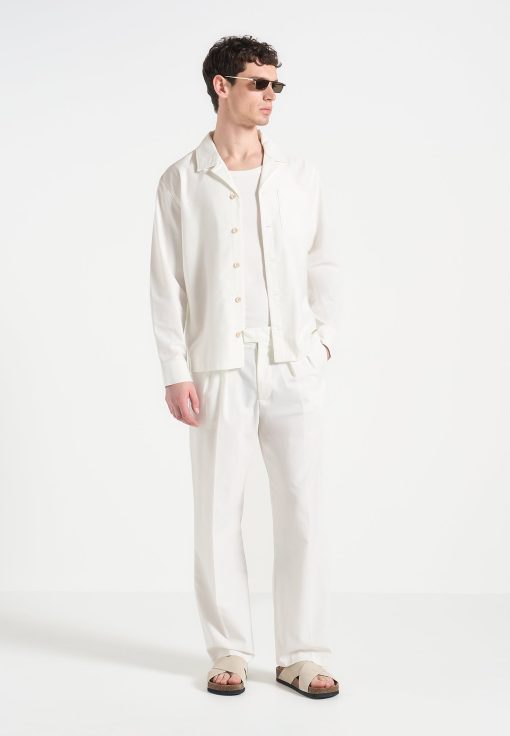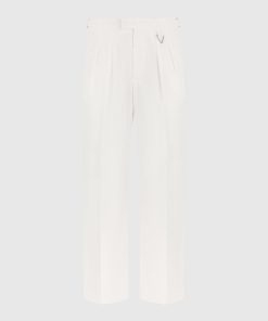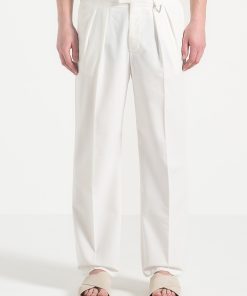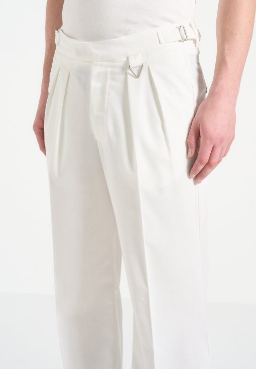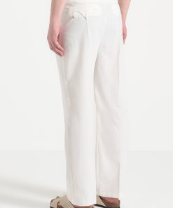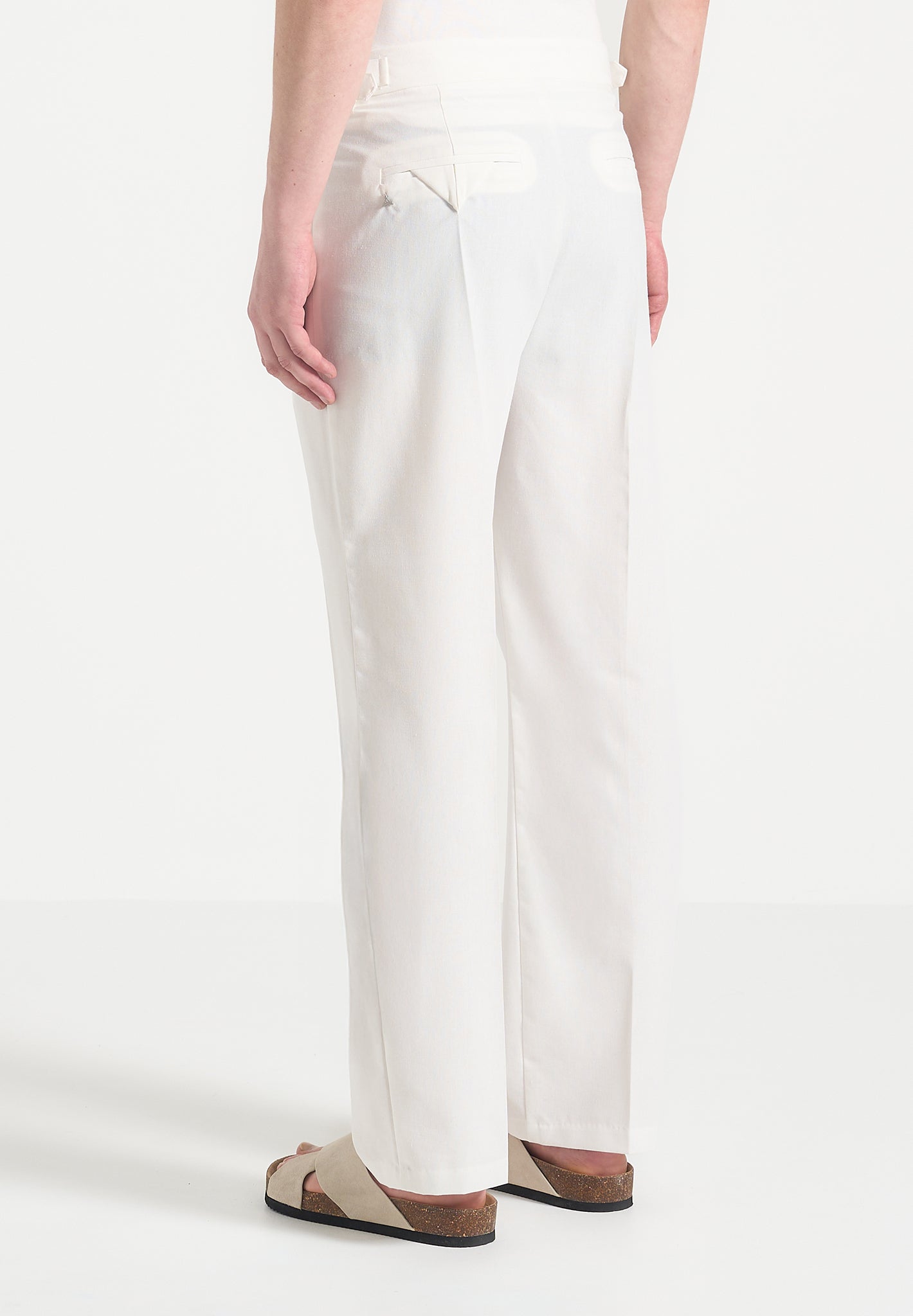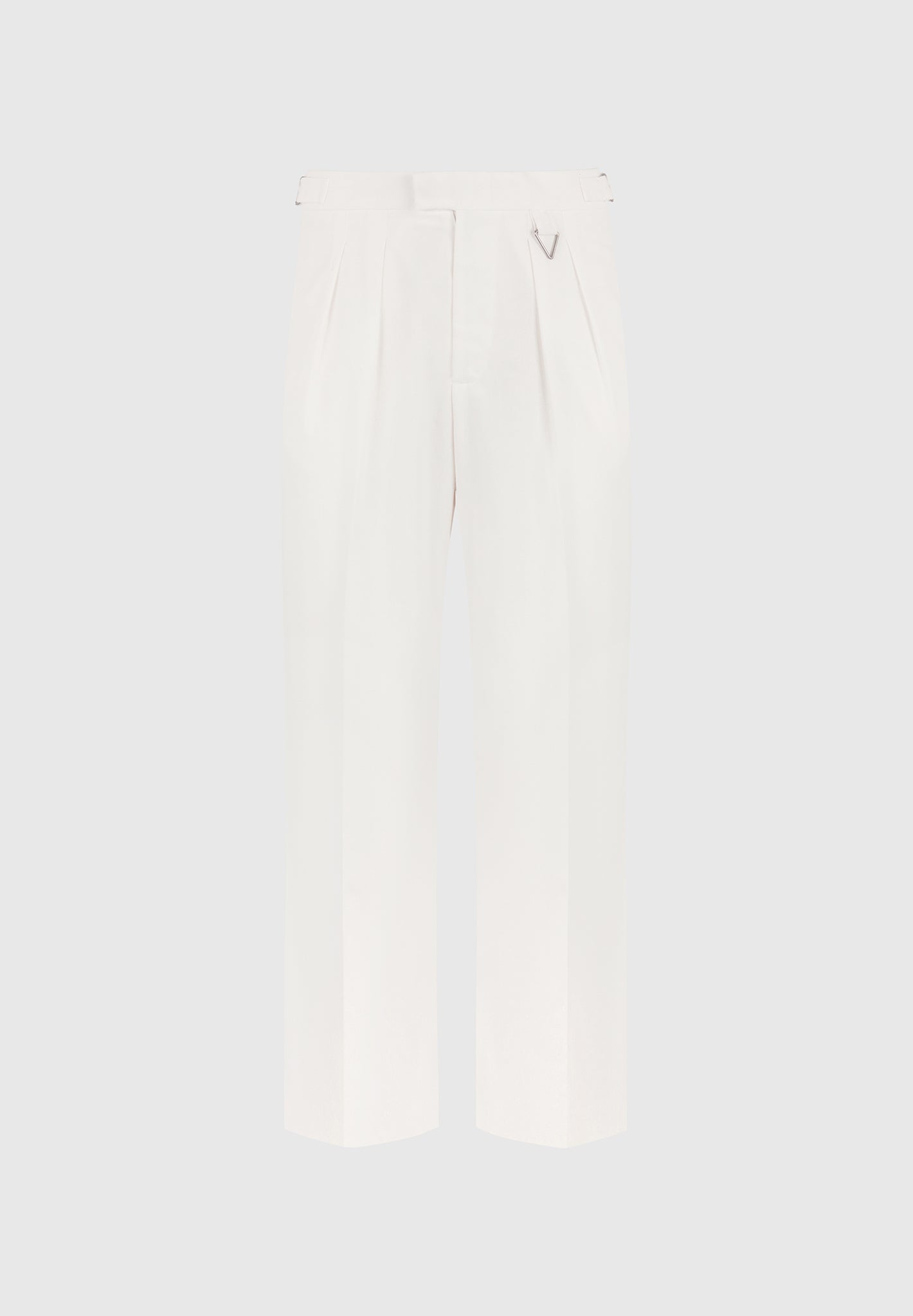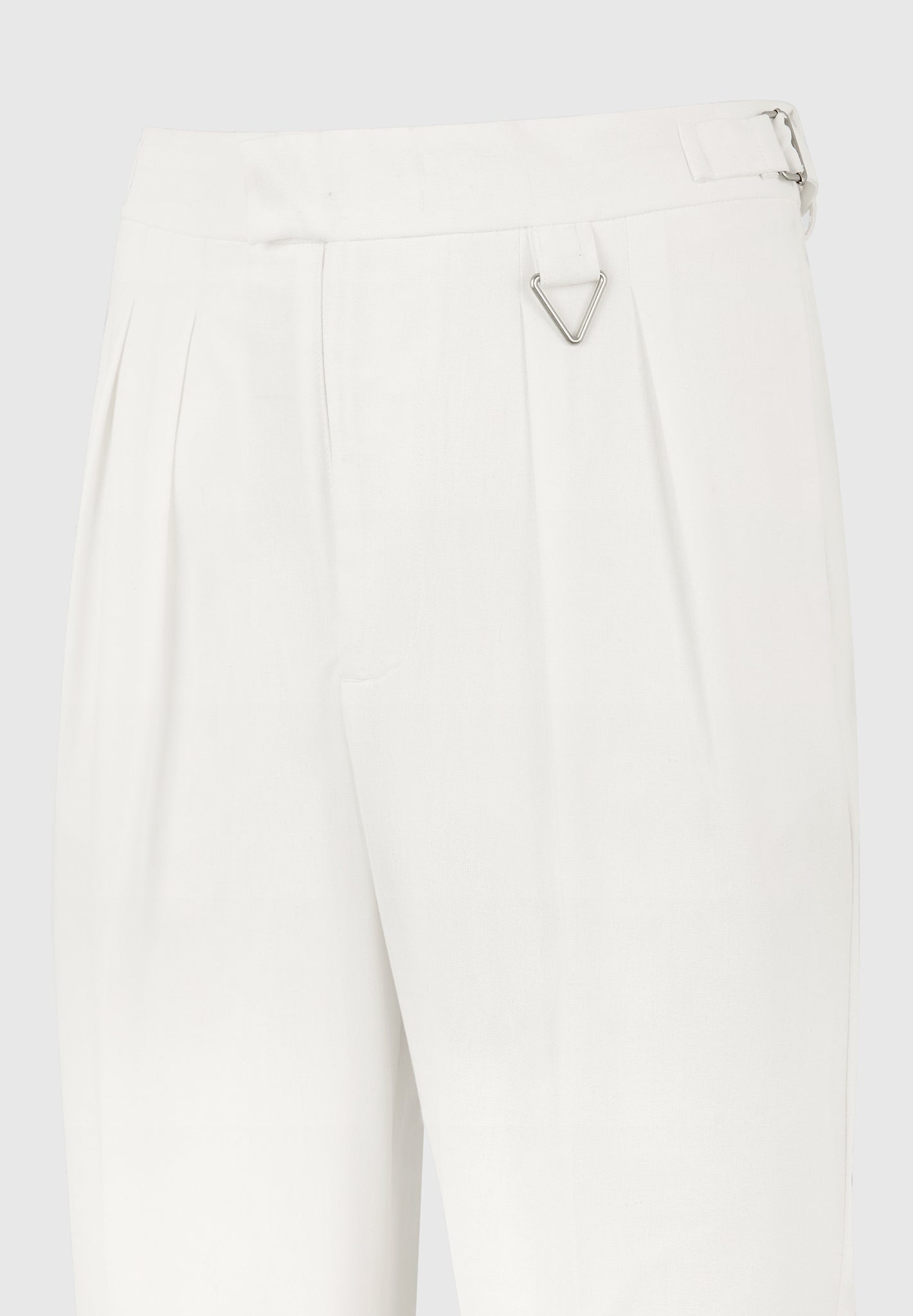 Crafted for form and flexibility, the Relaxed Fit Linen Trousers with Twin Pleat feature voluminous front pleats paired with a discreet adjustable waistband system. The side adjusters are seamlessly integrated, allowing for a tailored fit without a belt, preserving the clean silhouette and enhancing the trouser’s refined drape.