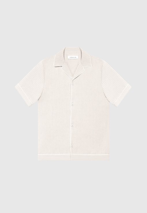 This Beige Pinstripe Revere Shirt is a must-have addition to your wardrobe. With classic pinstripe detailing and a timeless revere collar, this shirt brings style to any look. Pair it with our Pinstripe Shorts for an effortlessly put-together outfit.