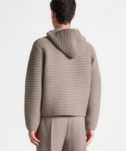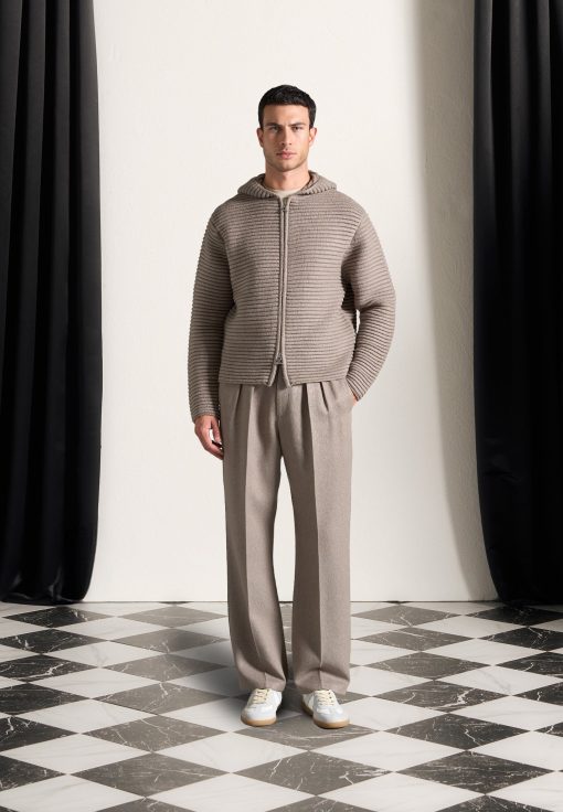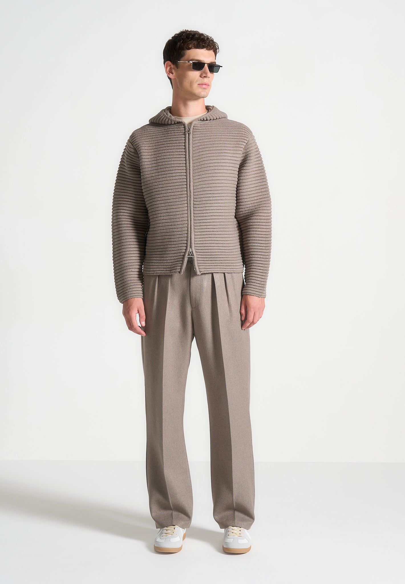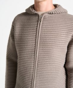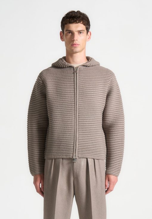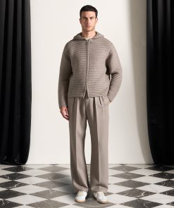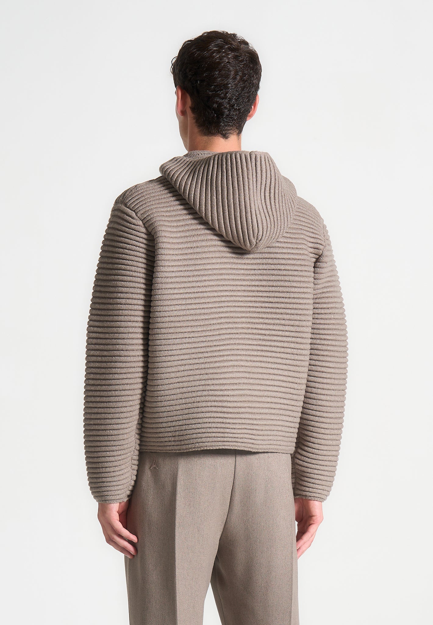 This Ribbed Knit Zip Up Hoodie in Taupe offers a sleek, modern look with a touch of luxury. The ribbed knit texture provides a premium feel, while the regular fit ensures all-day comfort. The hooded silhouette adds a contemporary edge, making it easy to style for casual or elevated seasonal outfits. A perfect blend of comfort and style, this hoodie is a versatile wardrobe essential.