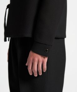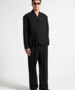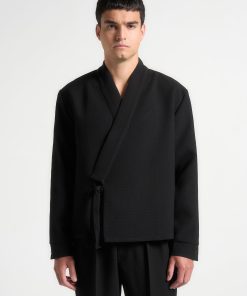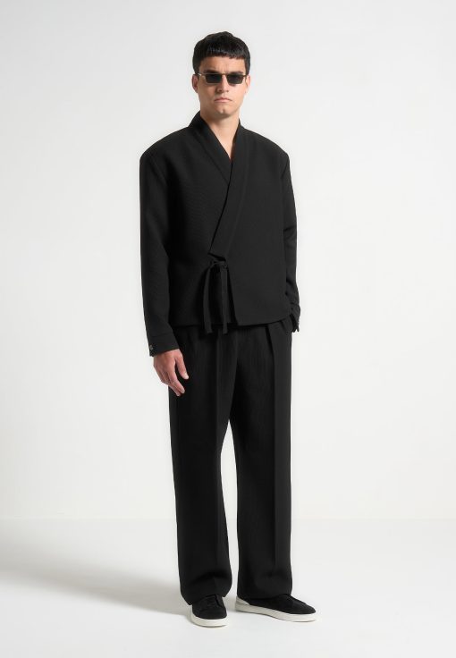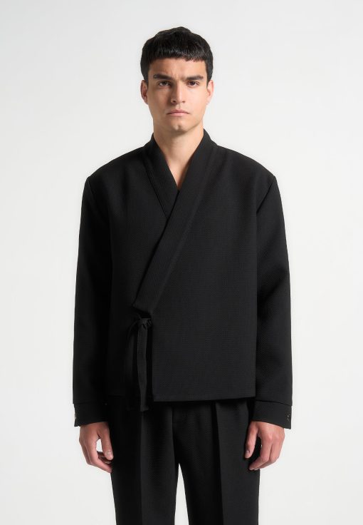 Introducing the Textured Kimono Wrap Jacket in Black, a standout addition to any wardrobe. Its distinctive textured material lends an air of refinement, while the self-tie fastening at the waist ensures a flattering silhouette. Featuring a V-neck collar and long sleeves, this jacket is the perfect choice for any occasion.