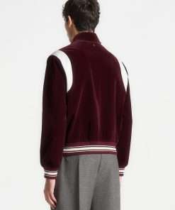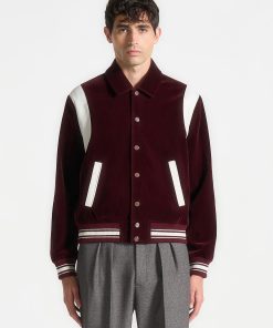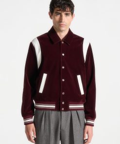 Introducing our Velvet & Satin Varsity Jacket in Wine Red. This jacket combines a classic retro silhouette with contemporary flair, featuring high quality fabrics and satin panelling. Finished with a practical, popper button closure, it offers the perfect blend of varsity style and functionality.
