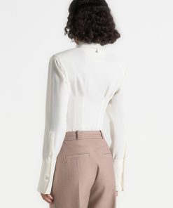 Introducing the Corset Shirt Bodysuit in Off-White. This stylish garment features a contoured shirt design, providing a flattering and comfortable fit. Made with quality materials, this bodysuit is perfect for any occasion.