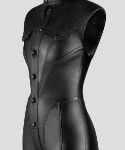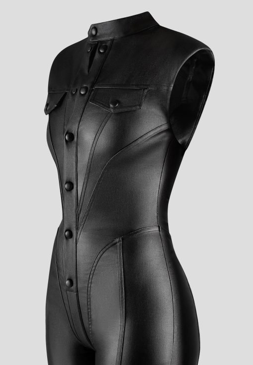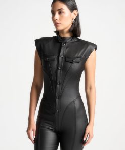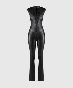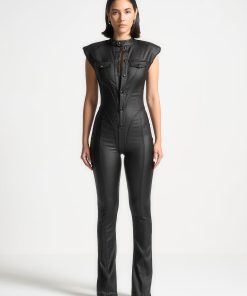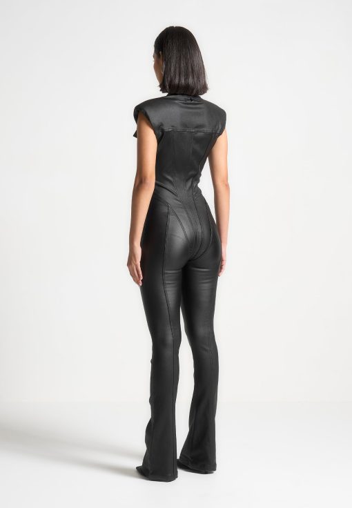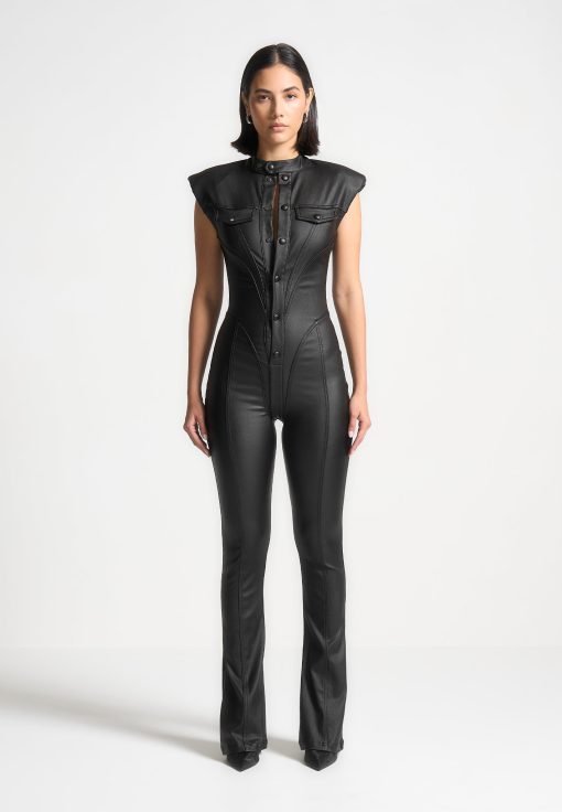 Expertly crafted with wax coating, this jumpsuit accentuates your shape with its figure flattering design and contour detailing. Its shoulder pads add structure and elegance, making it a versatile choice for any occasion. Showcase your confidence and style in this must-have jumpsuit.