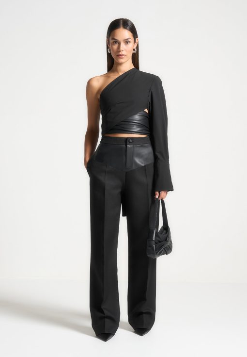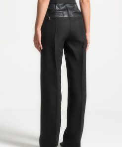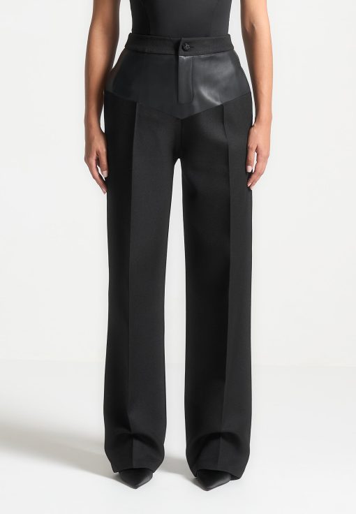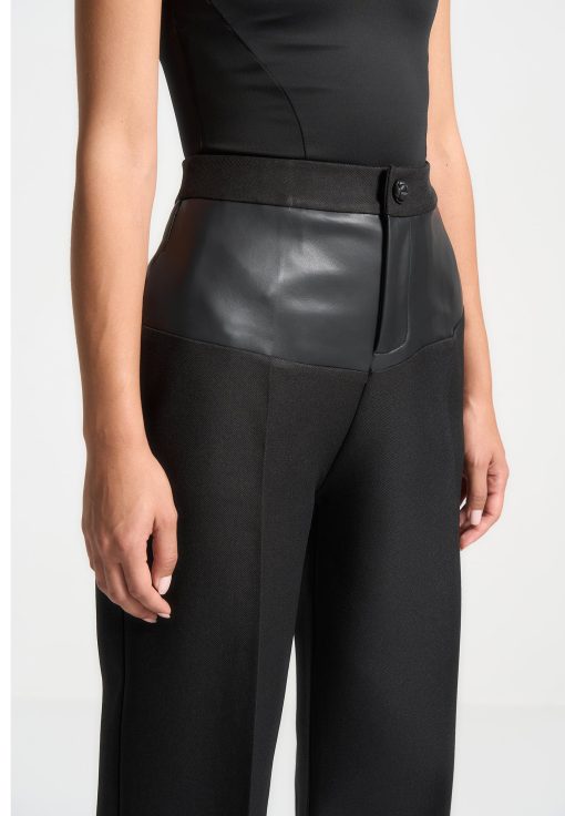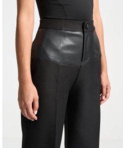 Expertly crafted with a flattering fit, these tailored trousers feature a unique addition of a vegan leather panel. Made from high-quality materials, these trousers provide a sleek and elevated look. Upgrade your wardrobe with these versatile trousers.