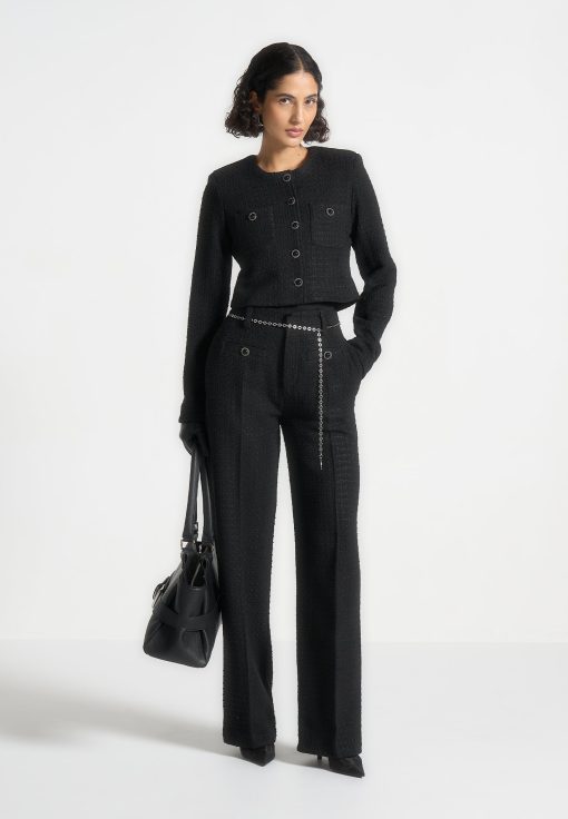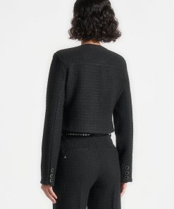 This jacket is designed with a cropped, fitted, and tailored silhouette. Its classic design exudes sophistication and style, making it a versatile piece for any occasion. Expertly crafted with tweed and pearl accents, this jacket offers an elegant and refined touch to your wardrobe.