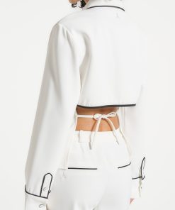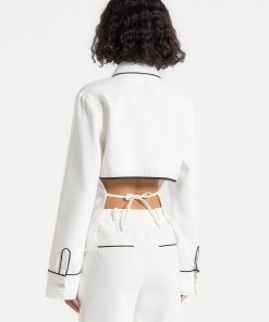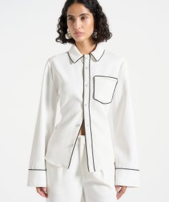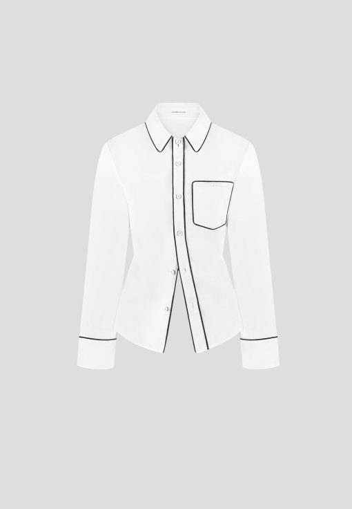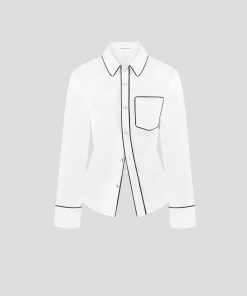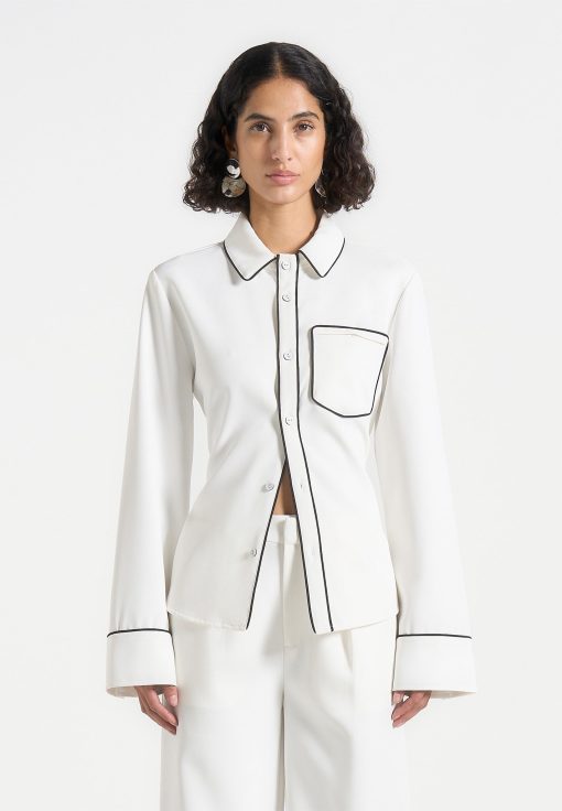 This elegant shirt features sleek contrast piping and a tie-back design. Perfect for transitioning from day to night, this versatile piece adds a touch of sophistication to any outfit. It’s a must-have for any fashion-forward wardrobe.