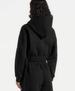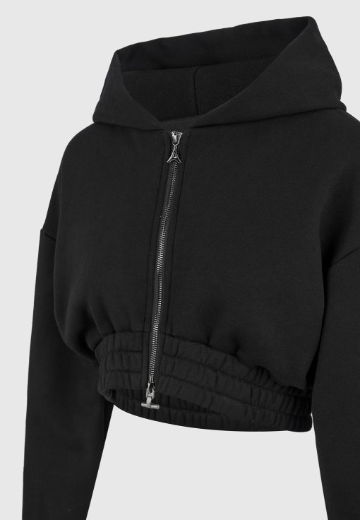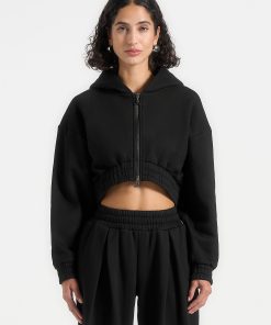 This cropped zip hoodie redefines casual wear with a structured twist. Cut from soft brushed cotton fleece, it features a high cinched waistband that sculpts the waist while creating volume through the body and sleeves. The exaggerated hood and dropped shoulders add relaxed contrast to the fitted hem, making it the perfect balance of comfort and contour.