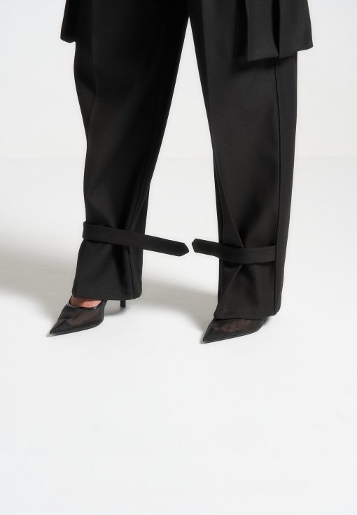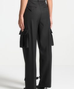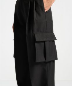 Our Tailored Pleated Cargo Trousers, crafted in black, feature a tailored fit for a sleek silhouette, as well as cargo features for enhanced utility. The trousers have a wide-leg cut that is perfect for an effortless look.