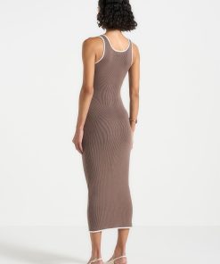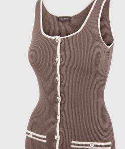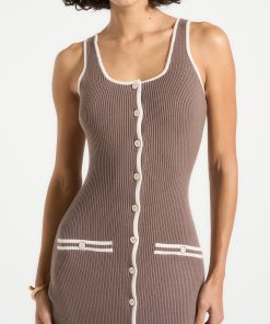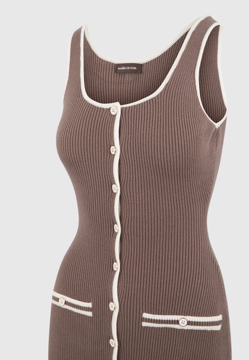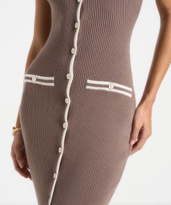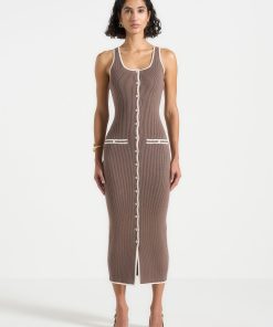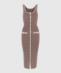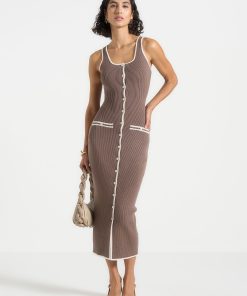 This ribbed midi dress fuses modern tailoring with classic contrast detailing. Designed in a body-contouring knit, it features a scoop neckline, a full-length button front, and cream contrast piping that sharpens the silhouette. Faux pocket accents and vertical ribbing enhance the lengthening effect, while the midweight stretch fabric ensures structure with ease of movement—perfect for refined daywear or elevated evenings.