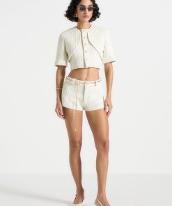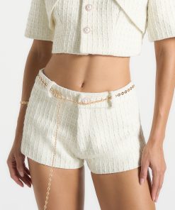 These mini shorts are crafted from high-quality woven tweed and fasten with a gold-toned pearl button. A statement gold chain belt, featuring the signature Eiffel charm and inner adjusters, completes the look with a polished, tailored finish.