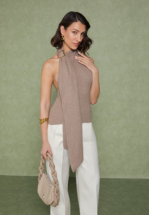 The Knitted Draped Halterneck Top is expertly crafted from soft-touch, non-itch yarn, offering both comfort and elegance. The design features a refined wrap-around drape and a high-quality metal adjuster for an elevated look.
