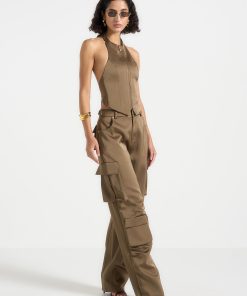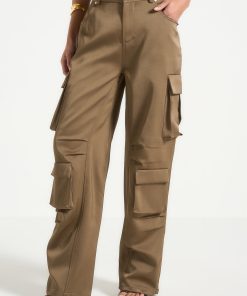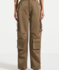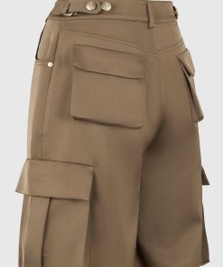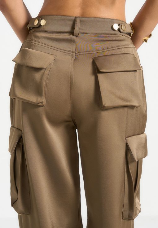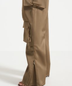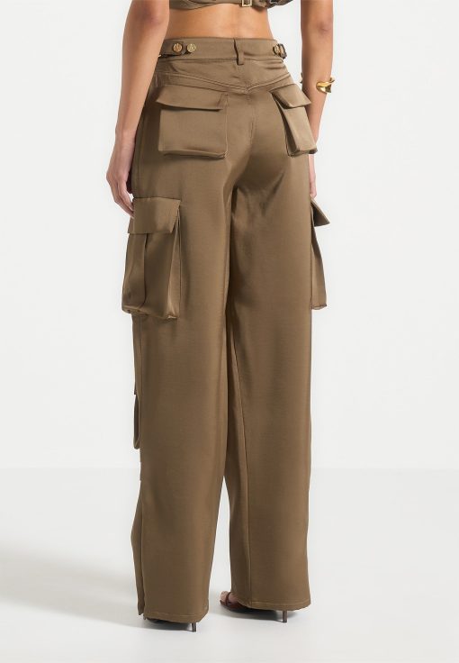 These wide-leg cargo trousers merge elevated fabric with utilitarian function. Crafted from a satin-finish woven material, they feature a mid-rise fit with a clean waistband, signature branded hardware, and multiple flap pockets for practical edge. The full-length silhouette is relaxed yet structured, designed to bring movement and statement styling to both casual and polished looks.