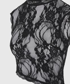 - Sleeveless fitted silhouette with sheer floral lace construction
