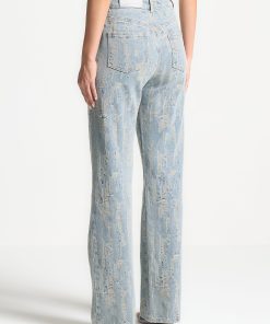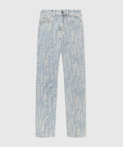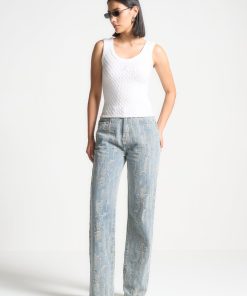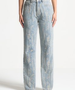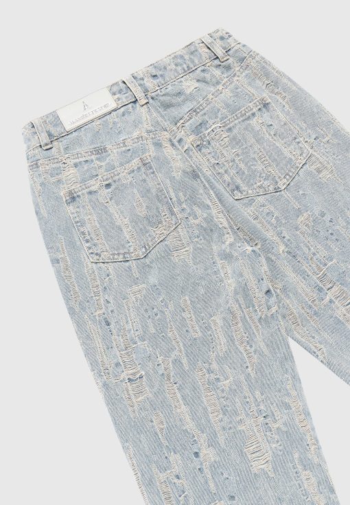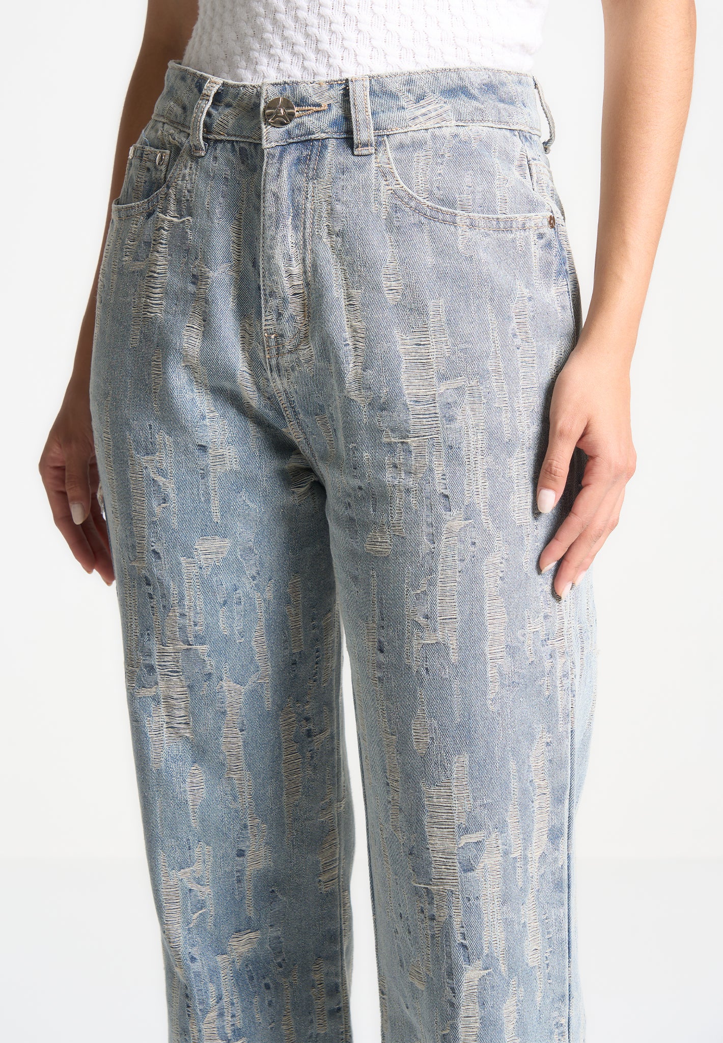 These quality denim jeans feature an all-over distressed detailing, adding a unique touch to their design. Crafted with expertise, these distressed high rise straight leg jeans provide a stylish and modern look. Upgrade your wardrobe with this trendy washed blue option.