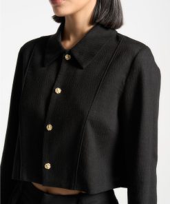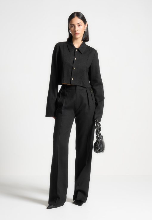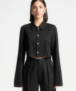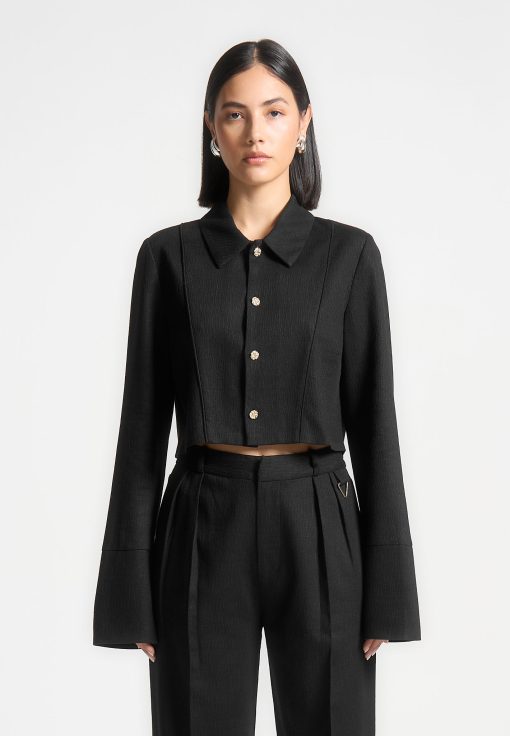 Showcasing a sophisticated cropped design, this Linen Shirt is perfect for adding a touch of elegance to any outfit. The contour piped detailing and deep cuffs add a unique flair, while the linen fabric ensures comfort and breathability.