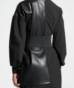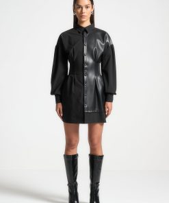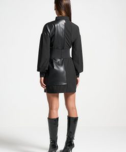 Achieve the perfect balance of stylish and fashion forward with the Half Vegan Leather Shirt Dress. Crafted from half vegan leather and featuring a cinch waistband and oversized high low hem, this dress is sure to become a wardrobe staple.
