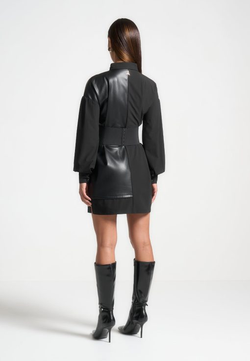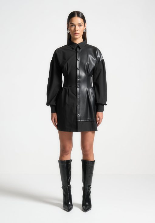 Achieve the perfect balance of stylish and fashion forward with the Half Vegan Leather Shirt Dress. Crafted from half vegan leather and featuring a cinch waistband and oversized high low hem, this dress is sure to become a wardrobe staple.