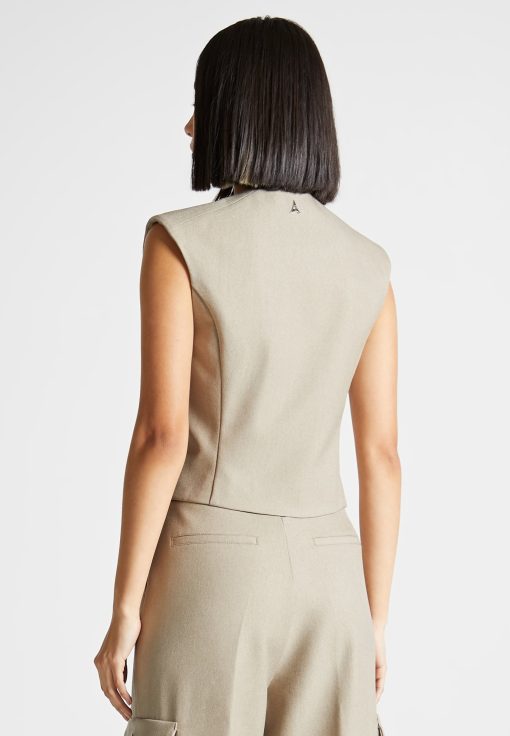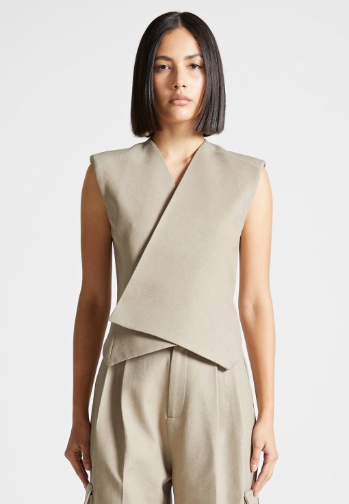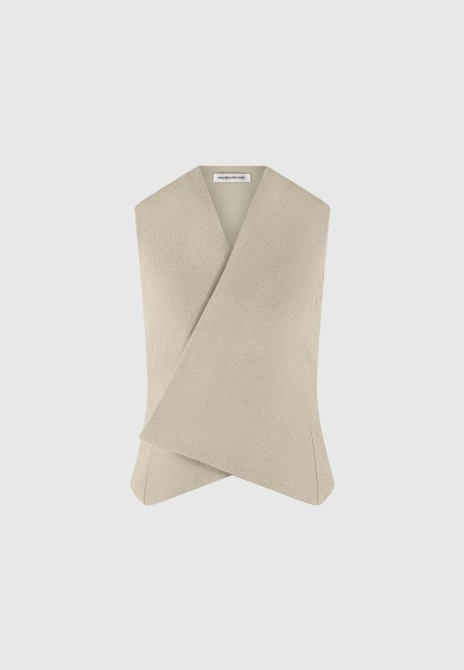 This beige waistcoat features a wrap silhouette with concealed buttons for a tailored, sleek look. Perfect for office-wear or special occasions, this Tailored Wrap Waistcoat pairs well with any outfit to add a tailored touch.