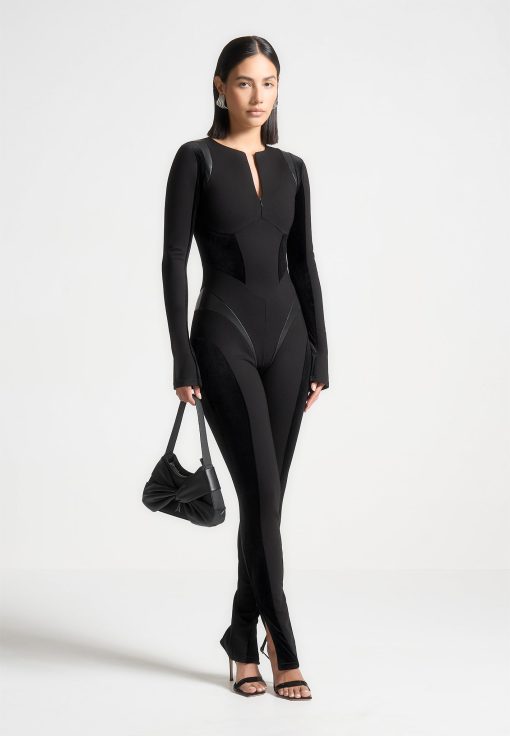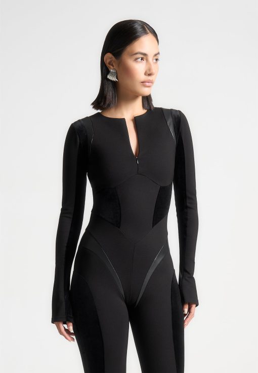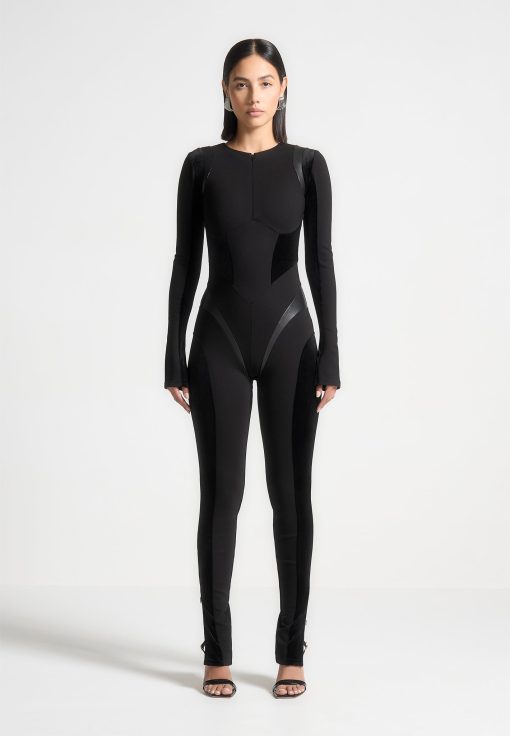 Crafted with a combination of vegan leather and suede, this black jumpsuit is designed to enhance your figure with its contoured silhouette. Perfect for any occasion, it offers both style and comfort. Upgrade your wardrobe with this unique piece.