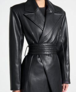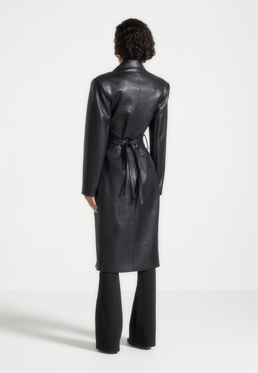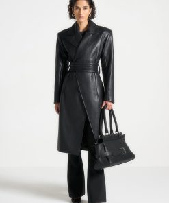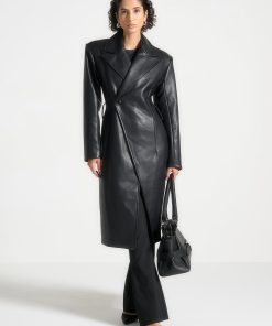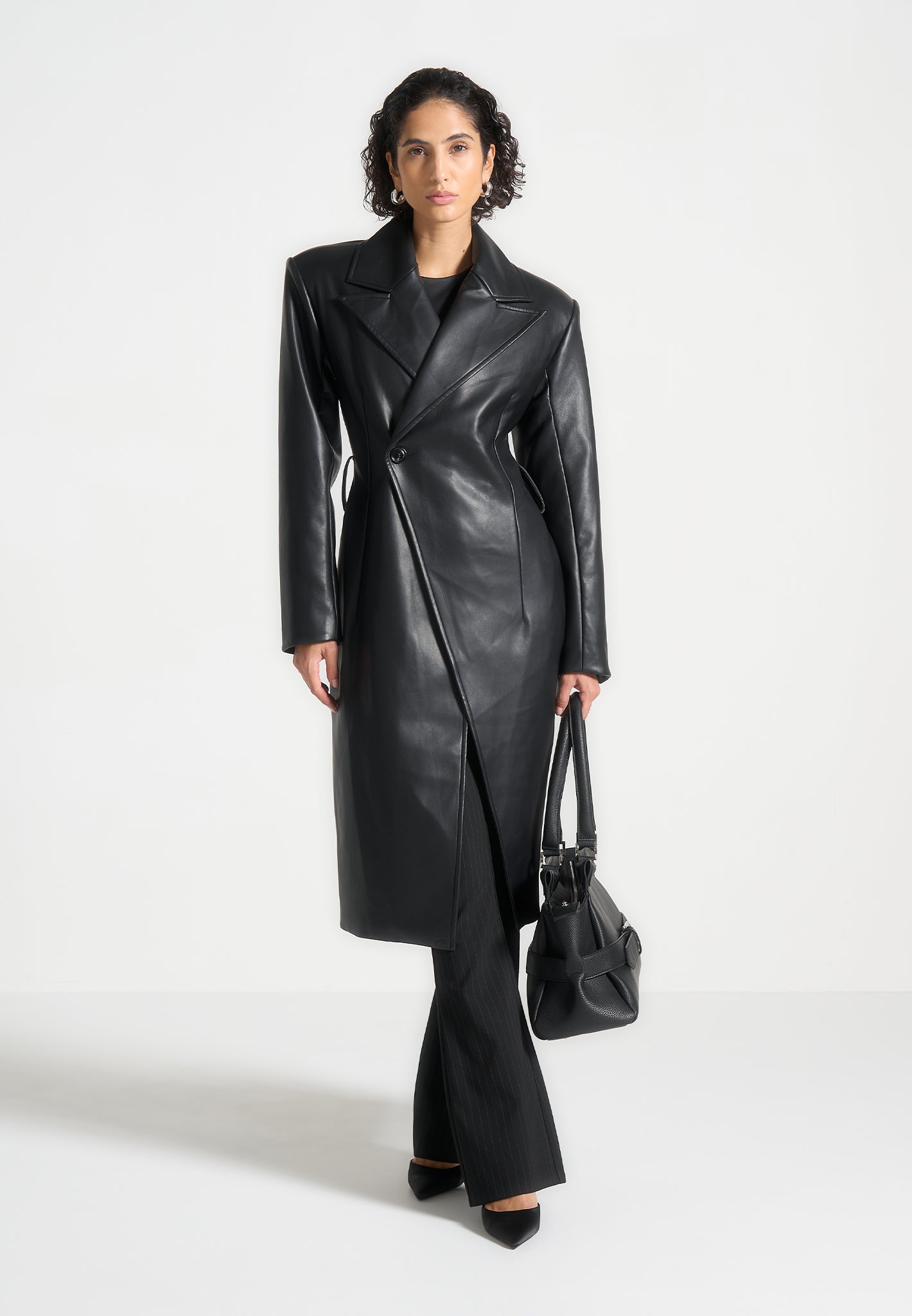 The Vegan Leather Asymmetric Belted Coat in Black offers a classic longline silhouette and a flattering fit with its belted waist. Crafted from vegan leather, this coat provides a timeless sleek look. Upgrade your outerwear collection with this versatile and chic piece.