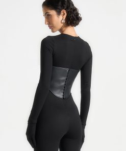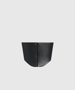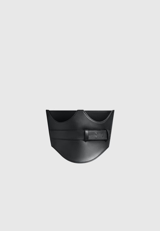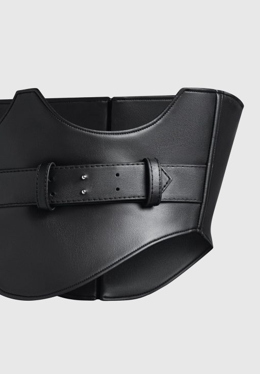 This Black Vegan Leather Corset Belt features a striking belt detail and a sophisticated dipped hem design. Made from high-quality vegan leather, it enhances any outfit with its sleek, modern style. Elevate your look with this cutting-edge accessory.