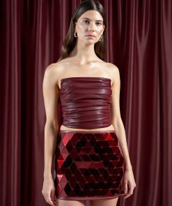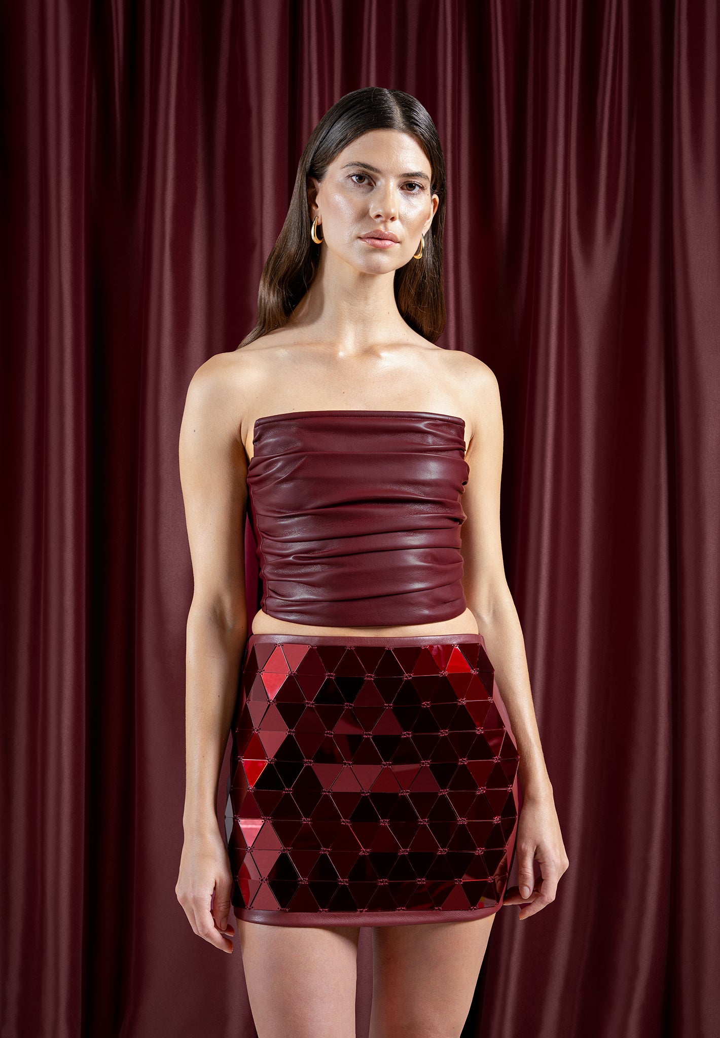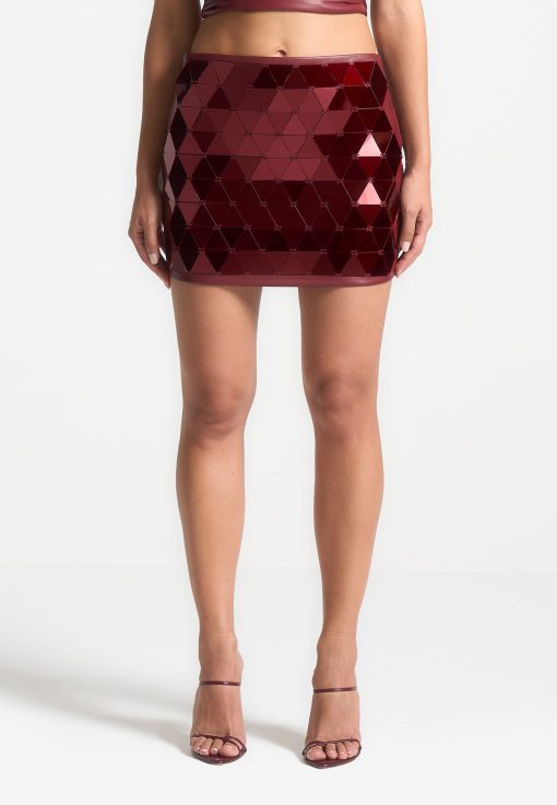 This mini skirt is crafted from luxurious vegan leather and beautifully embellished with unique mirrored accents, ensuring you stand out in any crowd. Add a statement to any outfit with this chic, stylish piece.