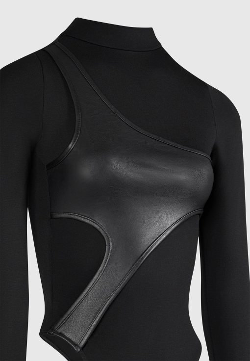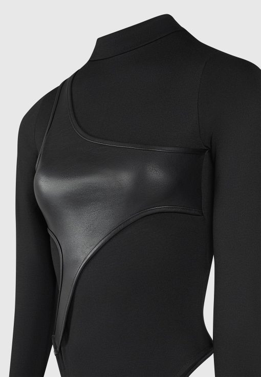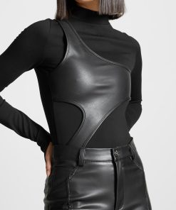 This Leather Overlay High Neck Bodysuit is perfect for any night out. Its leather contrast adds a chic edgy touch to the classic design. Its high neck style provides wearers with a sense of coverage and security.