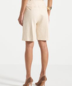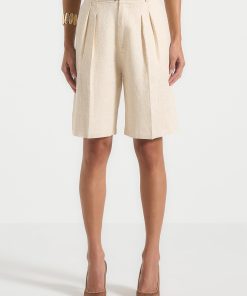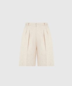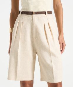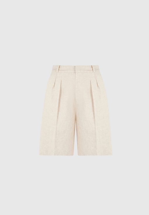 These tailored longline shorts offer a refined alternative to traditional summer silhouettes. Cut from a breathable linen fabric, they feature a high-rise fit with sharp front pleats and a relaxed leg that finishes just above the knee. Back welt pocket detailing and a clean waistband lend a polished finish.