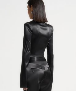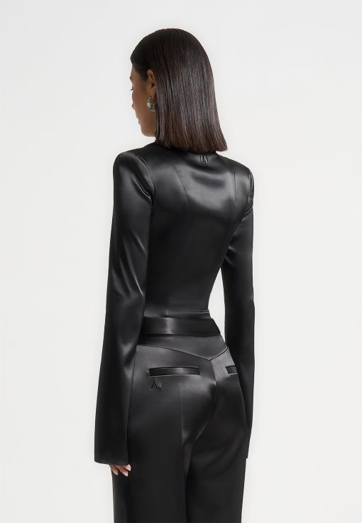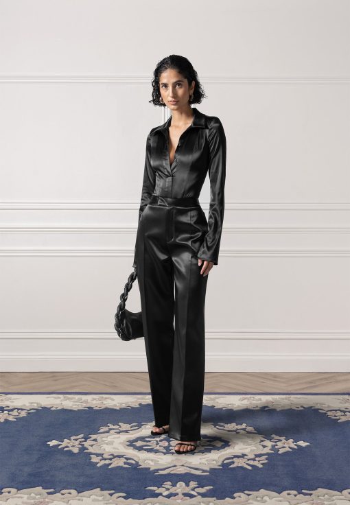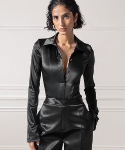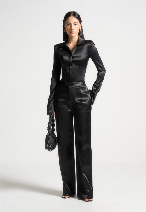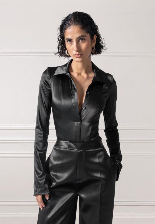 This satin bodysuit boasts a soft and silky texture, perfect for a polished look. With a button-up design and long sleeves, this bodysuit is both elegant and comfortable. Elevate any outfit with this versatile piece.