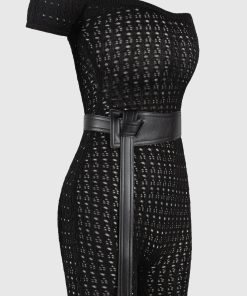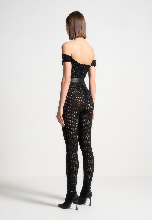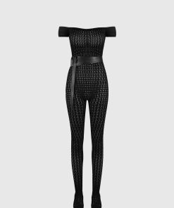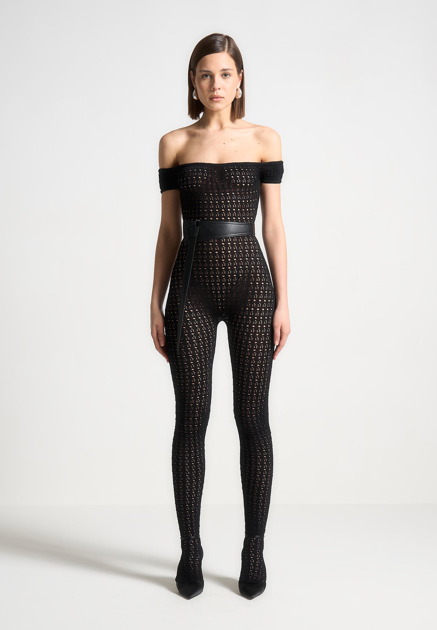Crafted from high quality pointelle knit, this bardot jumpsuit offers a figure-flattering silhouette with its stretch fabric. Perfect for any occasion, the attached belt adds a touch of elegance to this unique and fashion forward piece.