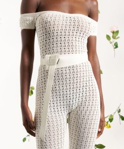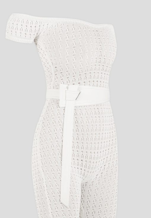 Crafted from high quality pointelle knit, this bardot jumpsuit offers a figure-flattering silhouette with its stretch fabric. Perfect for any occasion, the attached belt adds a touch of elegance to this unique and fashion forward piece.