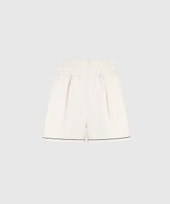 These tailored shorts bring polish to relaxed dressing. Cut from a smooth, structured fabric, they feature a softly gathered elastic waistband for comfort, pleated front detailing for shape, and contrast piping for a refined finish. Faux welt pockets at the back elevate the look, making them ideal for both lounging and elevated daywear. Pair them with the matching cropped shirt for a crisp, coordinated set.