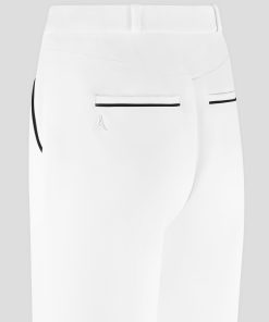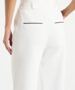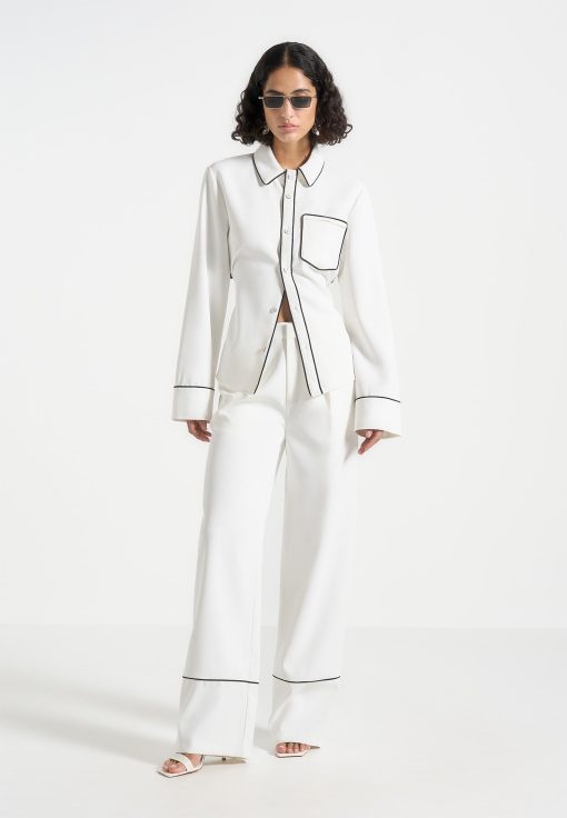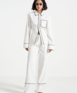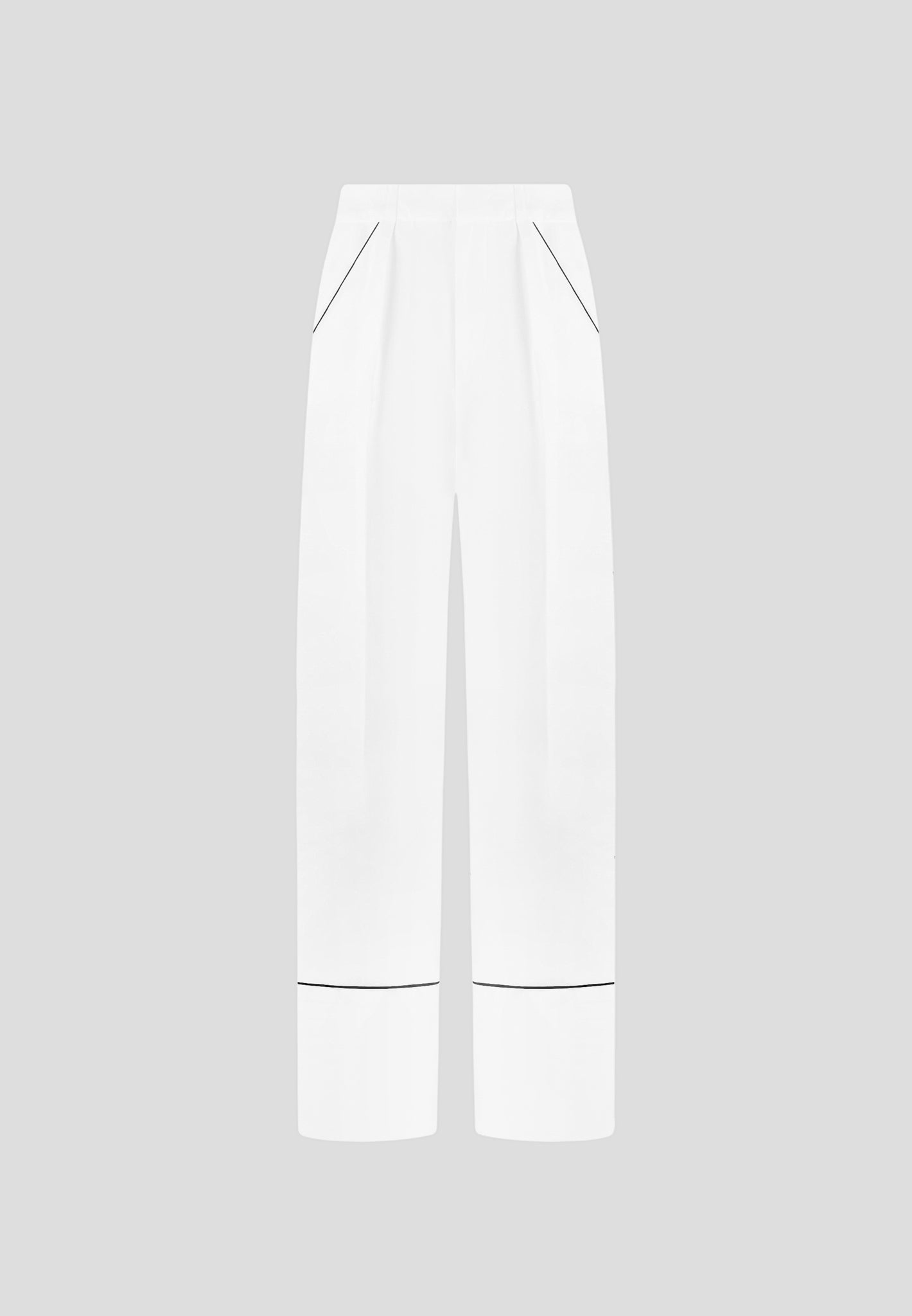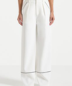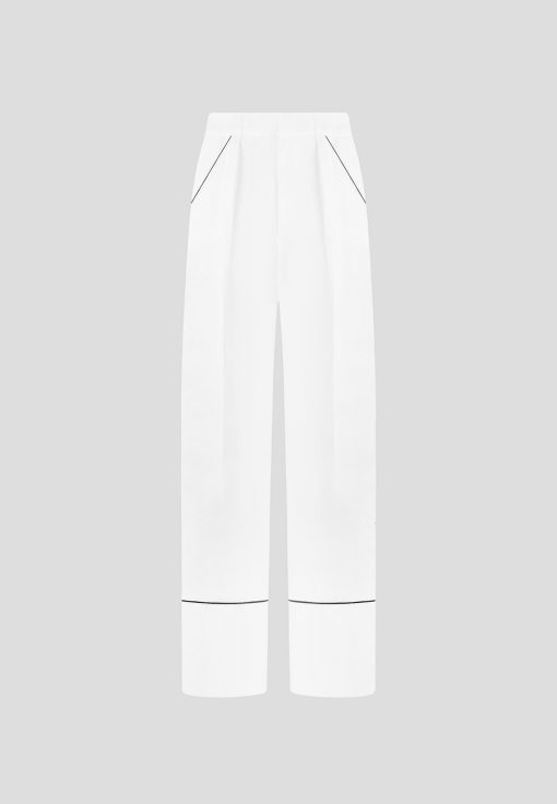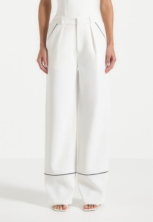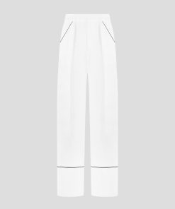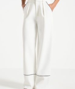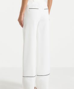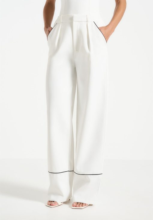 These tailored trousers feature a straight leg design with front pleat detailing, providing a figure-flattering silhouette. The contrast piping adds a touch of sophistication, making these trousers an elegant to addition to any wardrobe.