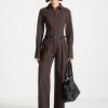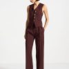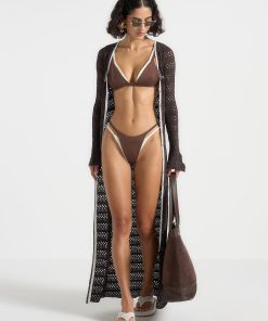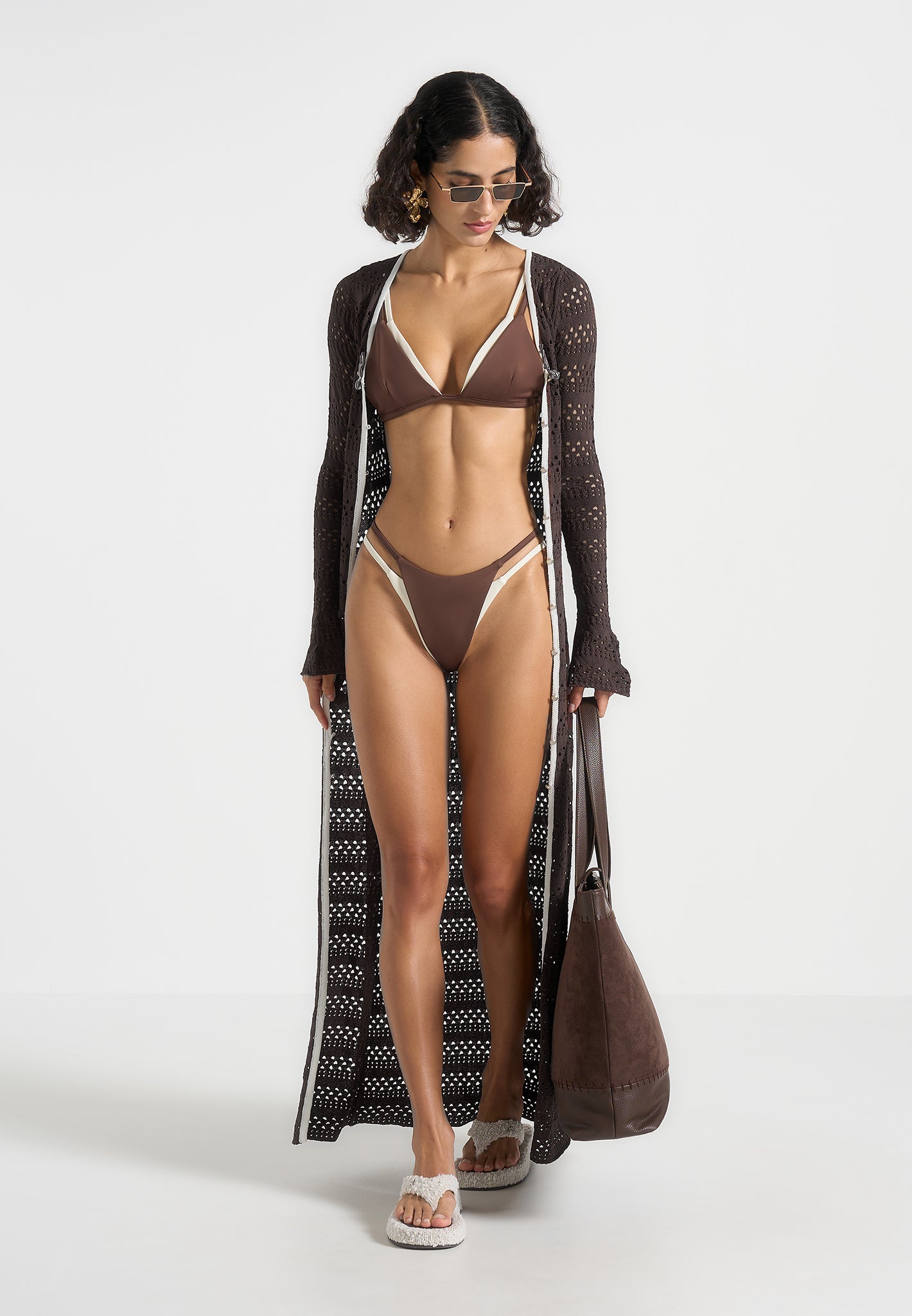 These two-tone bikini bottoms offer a bold, sculptural take on swimwear minimalism. The high-cut silhouette is framedby layered contrast straps in rich chocolate and cream tones, creating a sleek and modern visual line. Designed withminimal back coverage, they elongate the leg and contour the body—perfect for confident, statement swim styling.