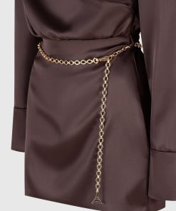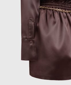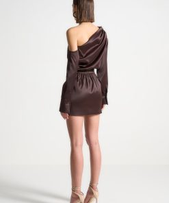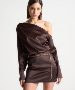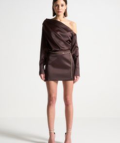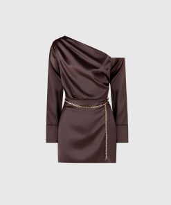 Manière De Voir Women’s Off Shoulder Draped Satin Mini Dress With Belt – Brown | Brown