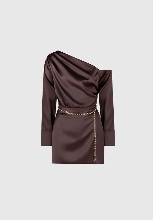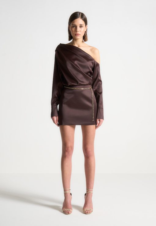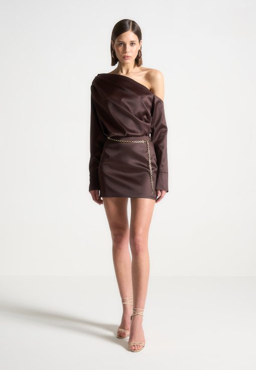 Manière De Voir Women’s Off Shoulder Draped Satin Mini Dress With Belt – Brown | Brown