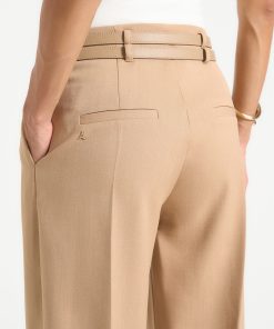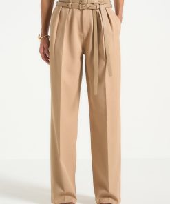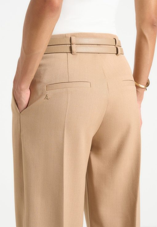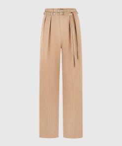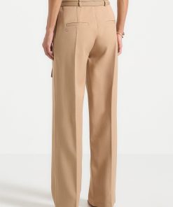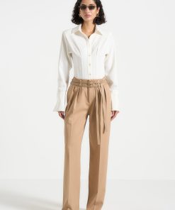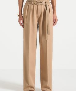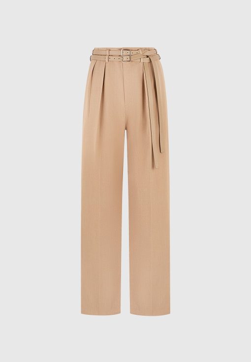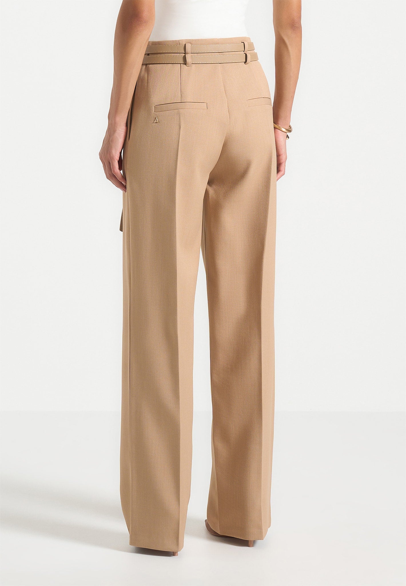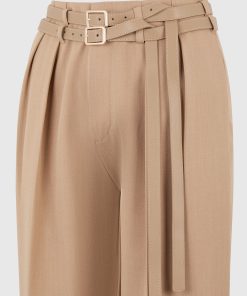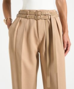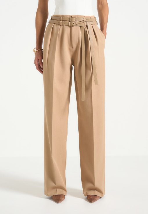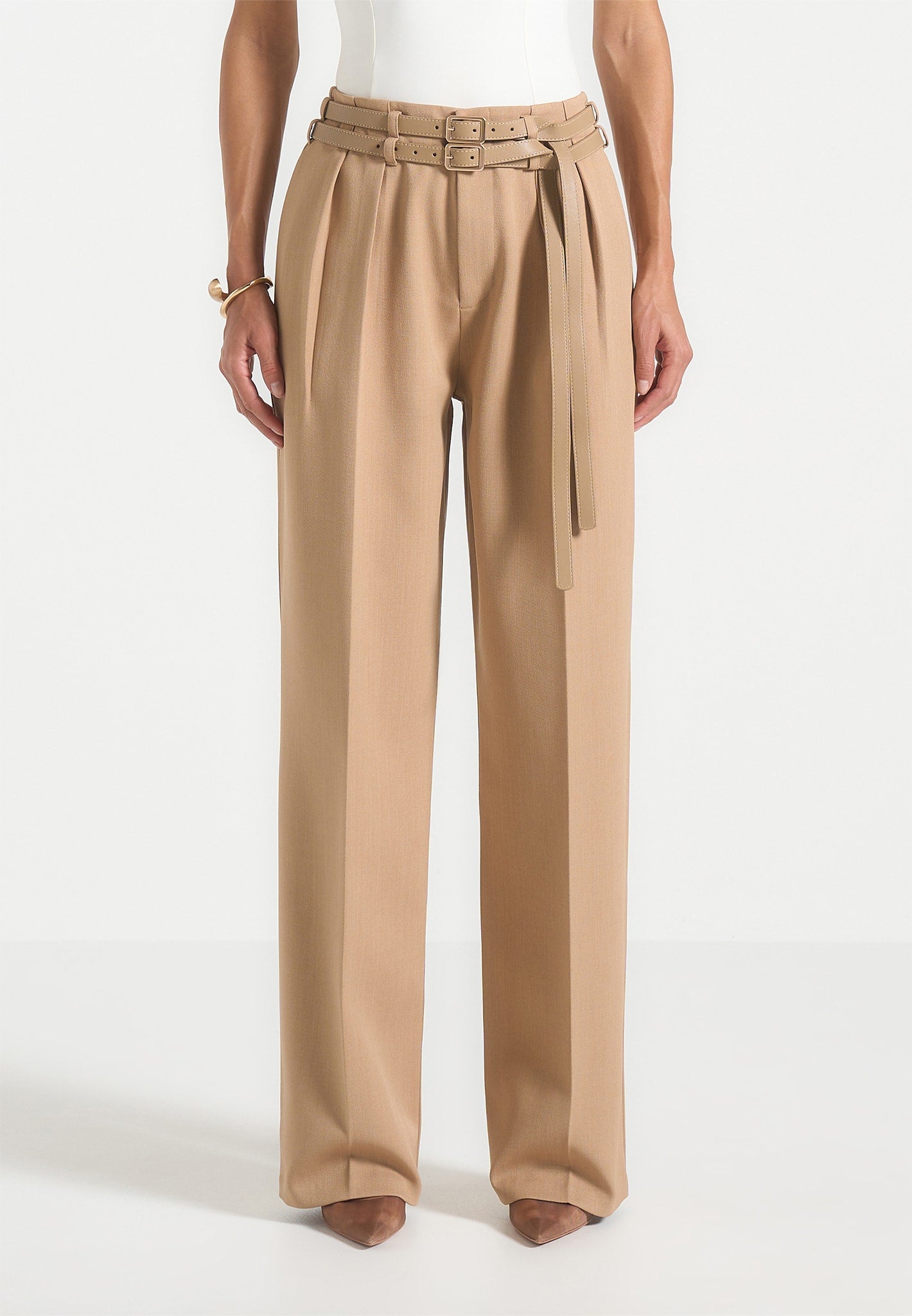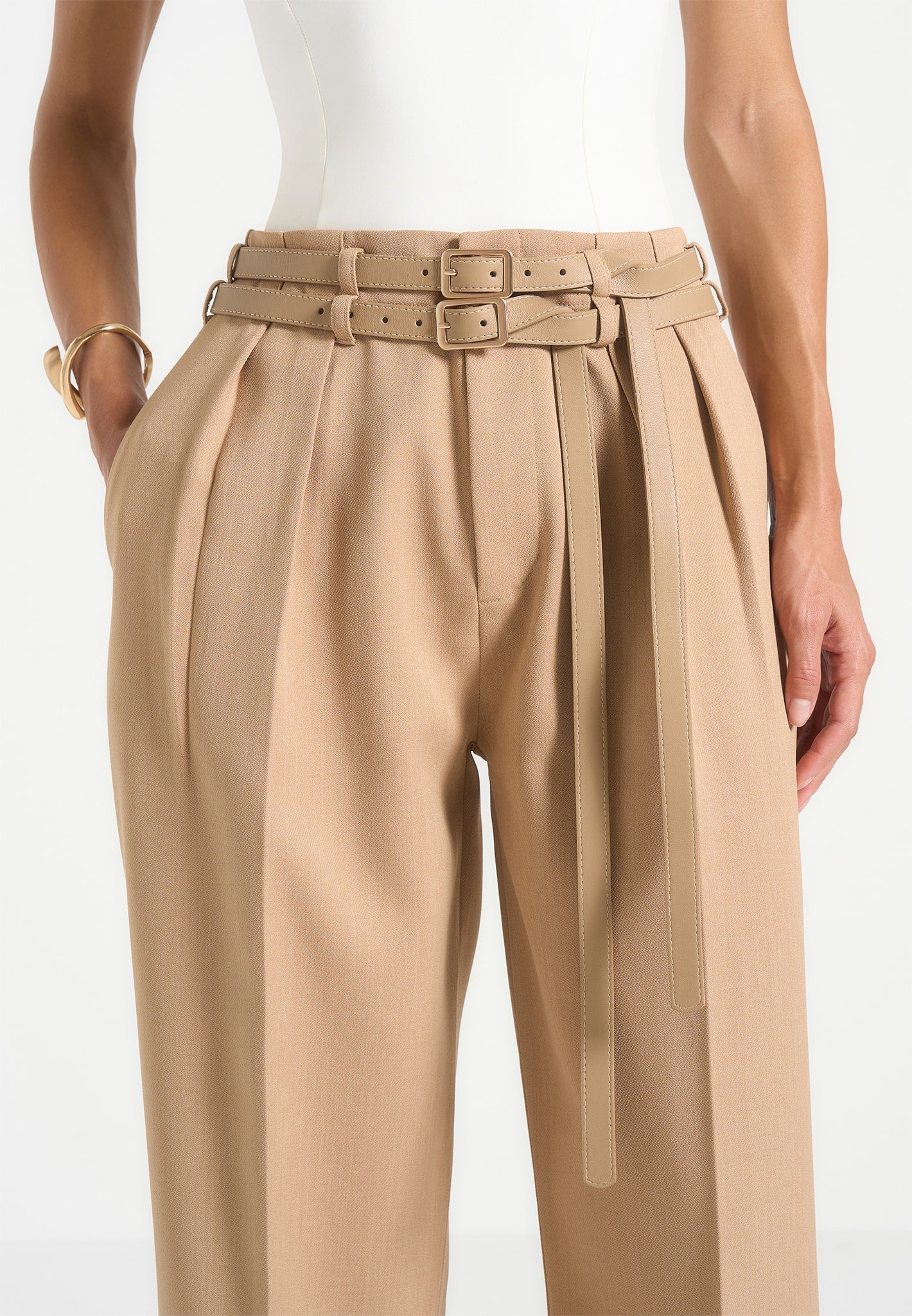 Tailored with a contemporary edge, these camel trousers blend sharp suiting elements with directional design. The structured silhouette features a high waist, front pleats, and a full-length straight leg that creates a streamlined profile. A distinctive double belt detail adds a modern twist, emphasising the waist with clean, layered hardware. Finished with welt pockets and pressed front seams, this piece brings a polished yet fashion-forward attitude to smart dressing.