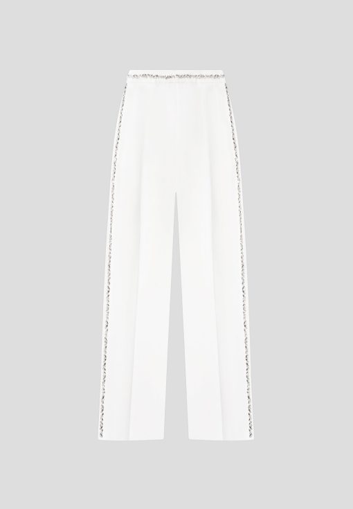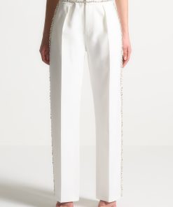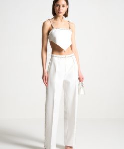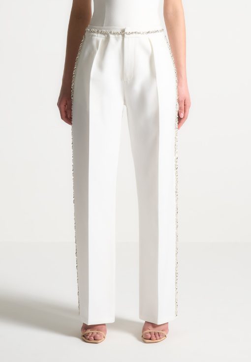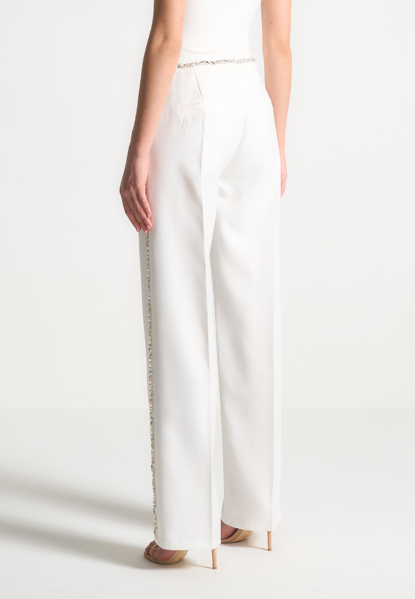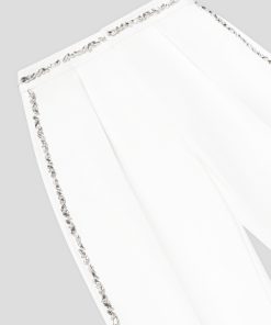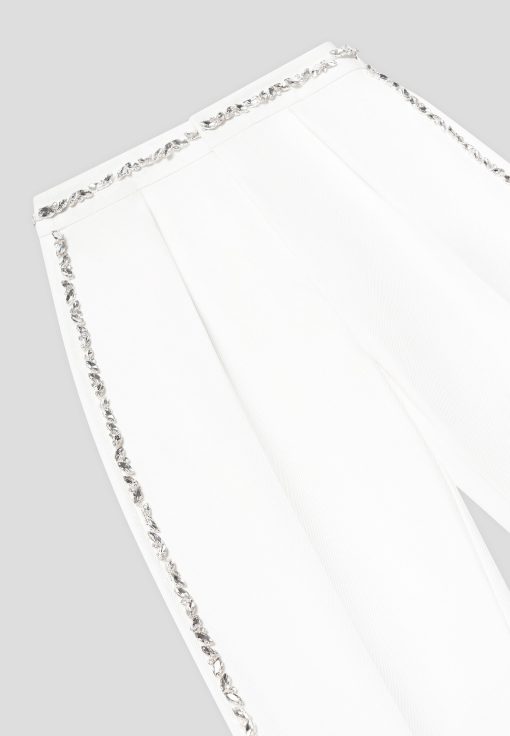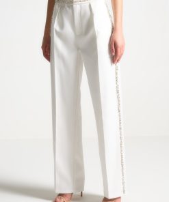 Expertly tailored for a perfect fit, these white trousers feature glamorous detailing and a sharp crease down the front leg for a sophisticated look. Elevate your wardrobe with these elegant trousers that offer comfort and style in equal measure.